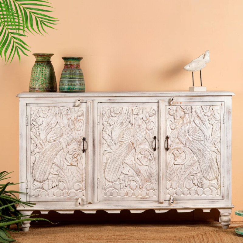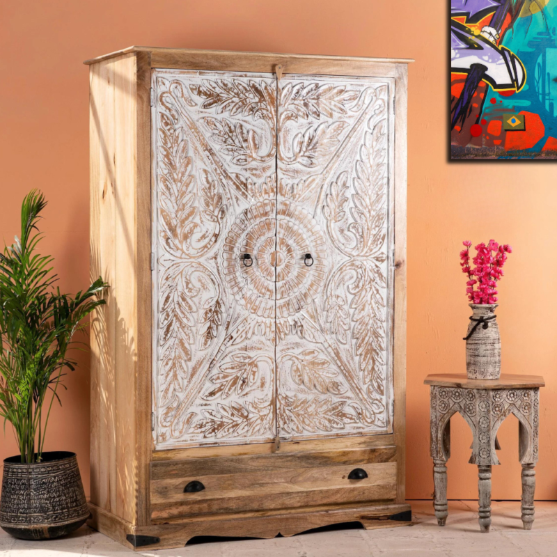 Modish Hand Carved Vandara Style White Washed Wardrobe