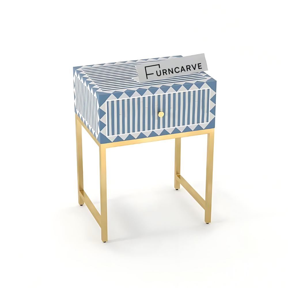Bring the bone inlay trend into your bedroom with the Abstract Design Bone Inlay Bedside Table, handcrafted by artisans in India using time-honored techniques. This bedside table would add glamour to any space with an intricate floral design, gold legs, and a handy drawer. It is a stunning piece and a work of art.