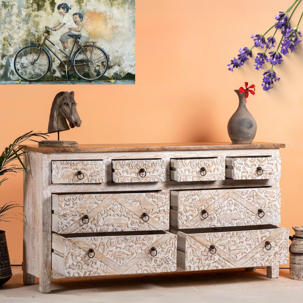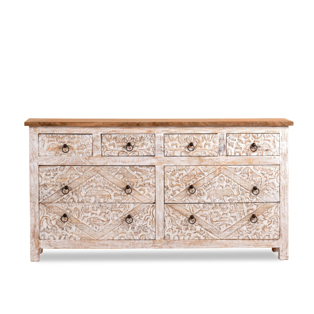 A magnificent handcrafted Indian Antique Chest of Drawers that embodies the essence of traditional craftsmanship. Meticulously crafted from premium mango wood, this exceptional piece showcases the natural beauty and durability of this exquisite material.