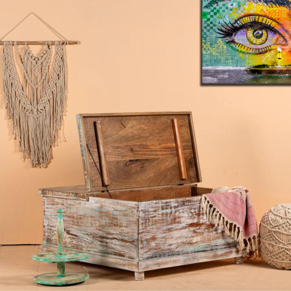 Antique Crafted Trunk Box comes in a shabby chic style and will be an eye-catcher in your living room or bedroom. One part of this table consists of a big box, and the second part holds 3 small and 2 bigger drawers. With plenty of storage facilities for your magazines or a little house bar, it is an ideal coffee table in front of your sofa.