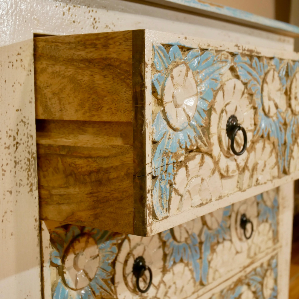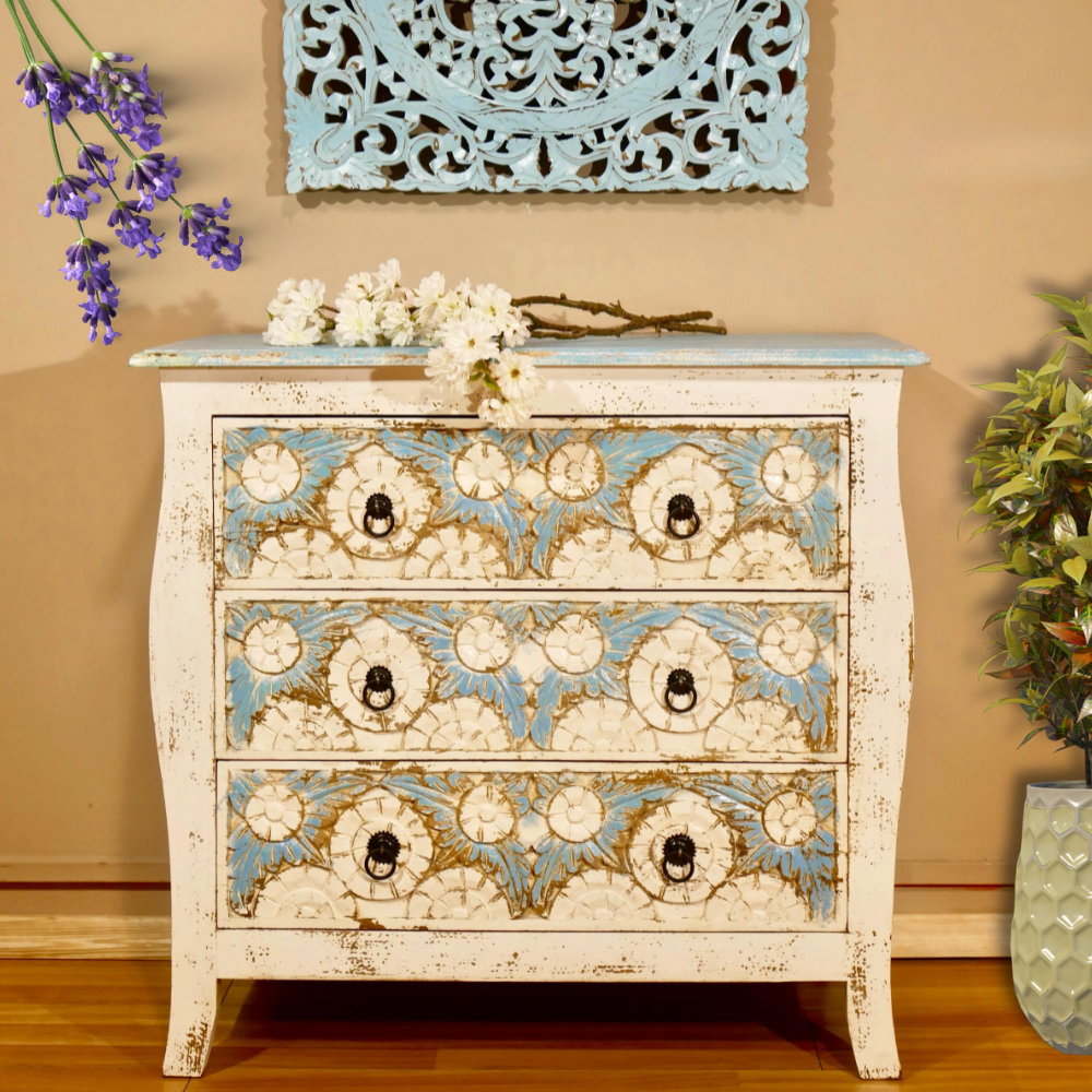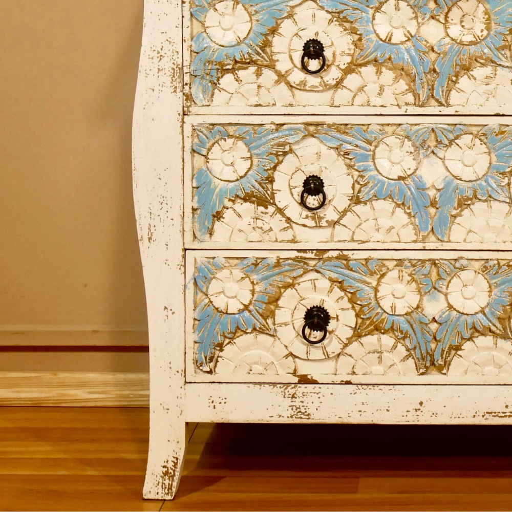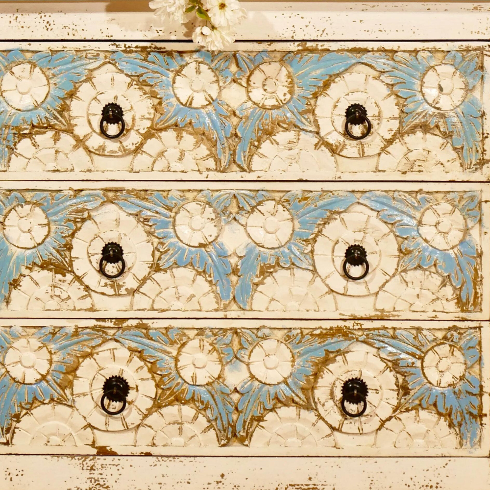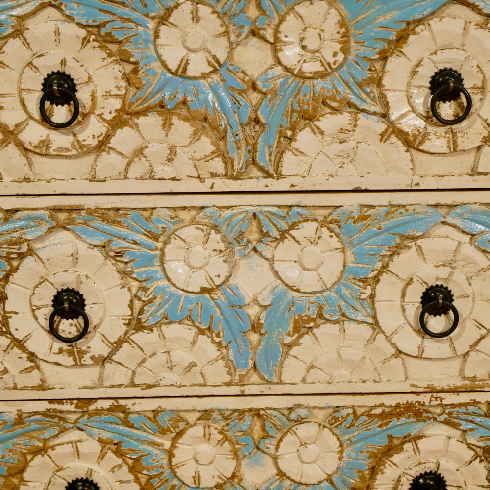 Indian chest of drawers Arlen has a Mediterranean style and will be an eye-catcher in your living room, your bedroom, or your bathroom. With its 3 large drawers, it offers plenty of storage space. The entire front part of this chest is richly decorated with floral handmade carvings.