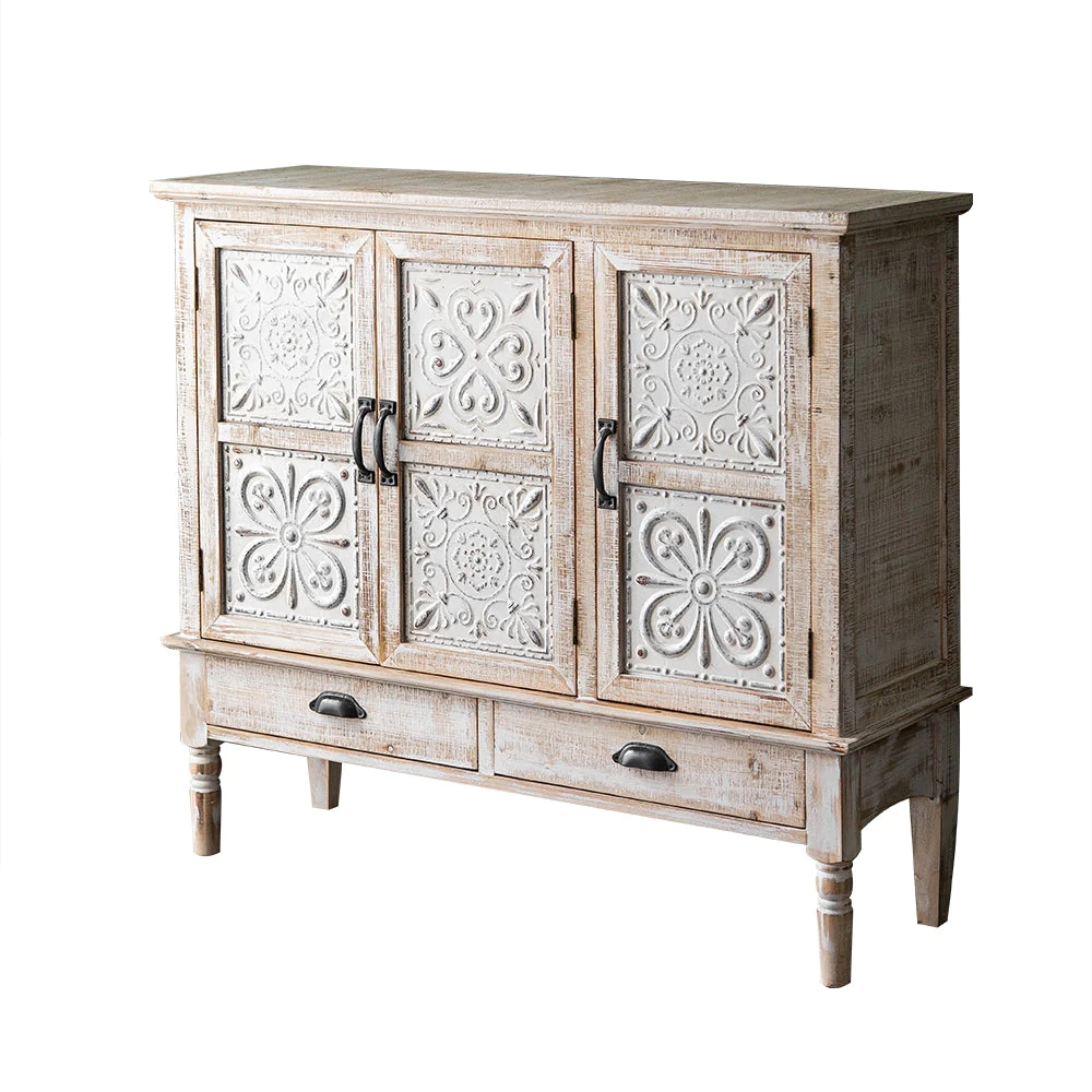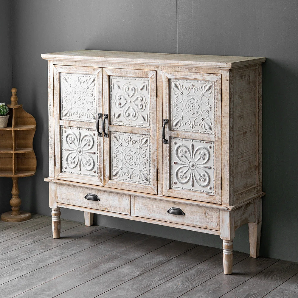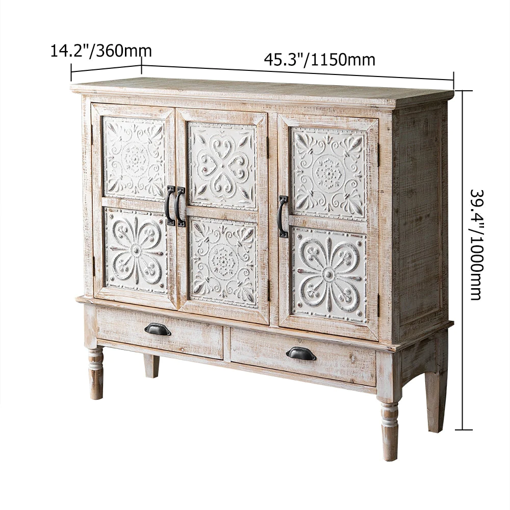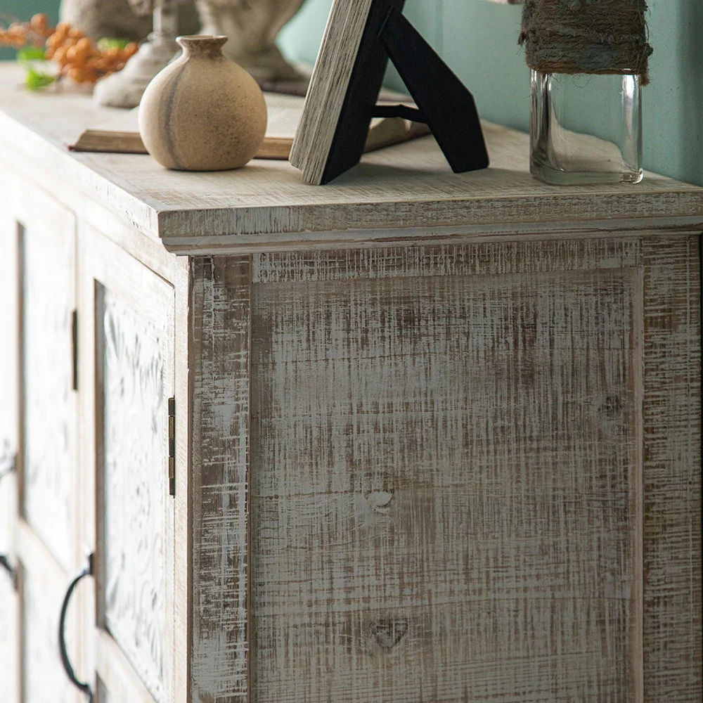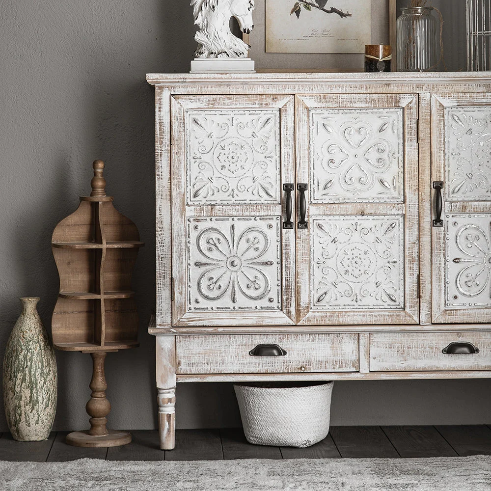 Our Indian handcrafted sideboard “Distressed White Sideboard” features delicate floral carvings and a white-washed finish. This piece of furniture is crafted by expert artisans in India using traditional methods. The white-washed finish imparts a charming rustic look that will blend well with home decor.