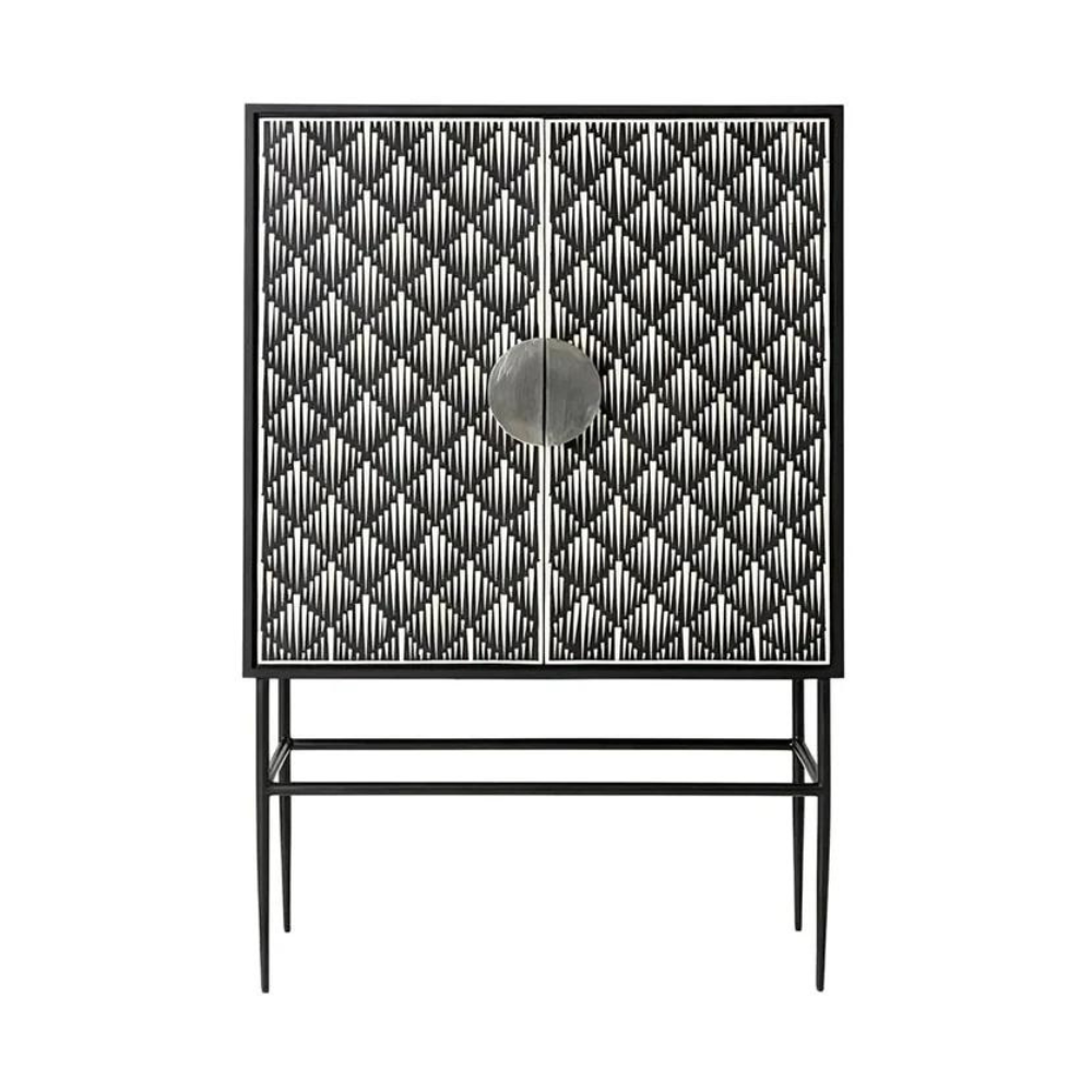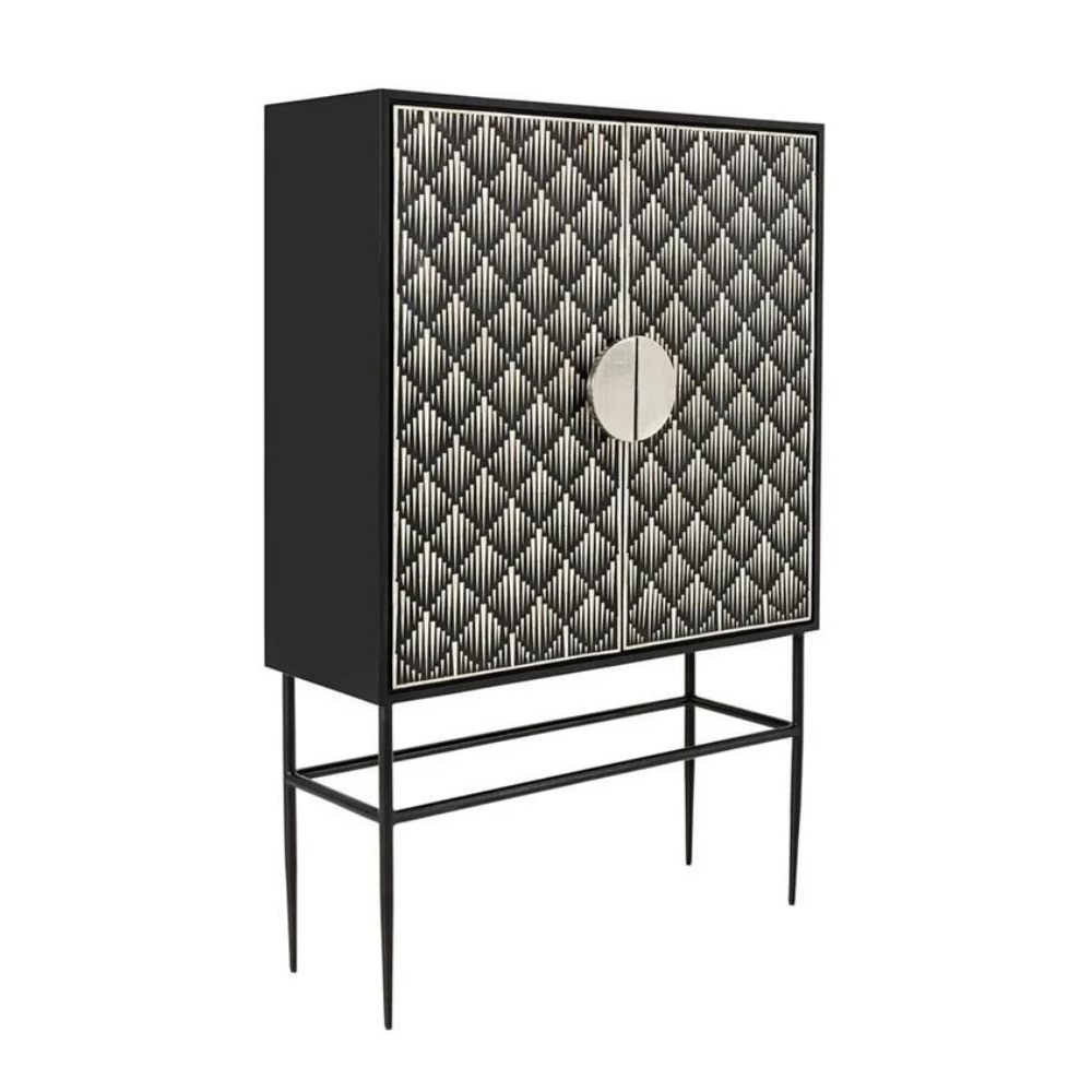 Bone Inlay Arrow Bar Cabinet with eye-catching design and jaw-dropping bone-inlay details, this drinks cabinet is a real showstopper. The tradition of bone inlay furniture is one that’s been passed from generation to generation in India. With the bone collection, the best of contemporary design and handcrafted artisanship come together in an exquisite range for the discerning buyer. This drinks cabinet will make a lasting impression with a solid mango framework, powder-coated steel legs and handles, and design details from ethically sourced bone. Make it the centerpiece of your living room or dining room, then run your hand over it in appreciation.