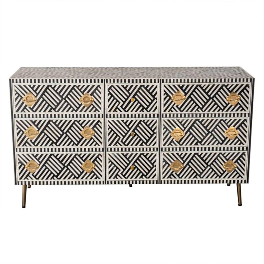 Exclusive Handmade captivating Chest of 9 Drawers is a unique possession piece to be smitten with for years to come and is even more picturesque in this large size. This multifaceted chest of drawers can be used in a living room, bedroom, entry or hallway. This Chest of Drawers features three small and four half-full-length drawers below, making it a flawless storage unit for a bedroom or living room. The bone inlay’s ravelled design, coupled with the colourful resin background, allows this piece to add an exotic touch to any home decor. This chest of drawers is from our selection of bone-inlay furniture that comes in a wide variety of colours to suit your decor.