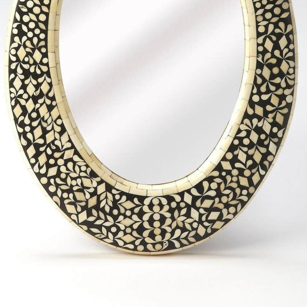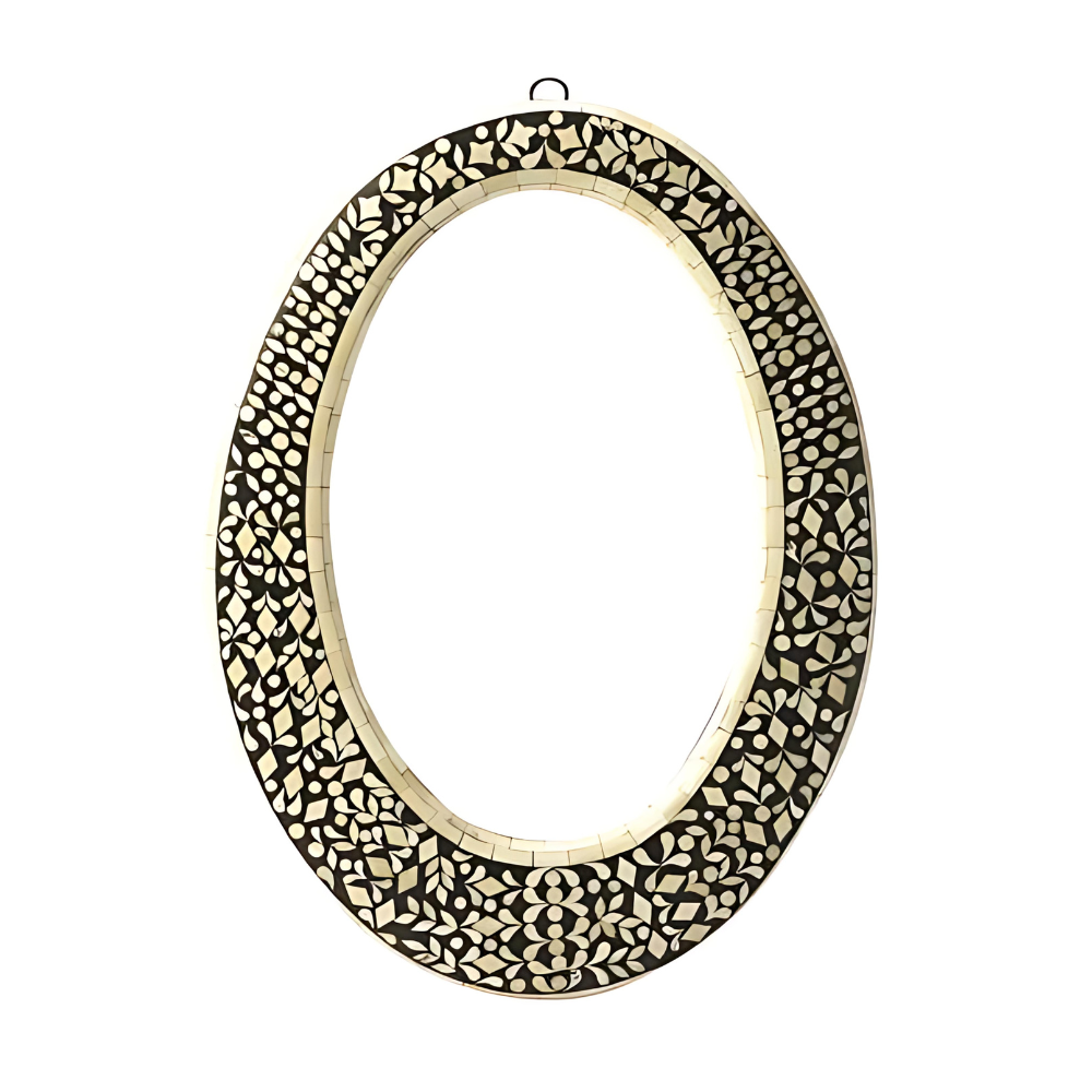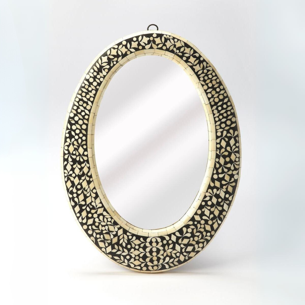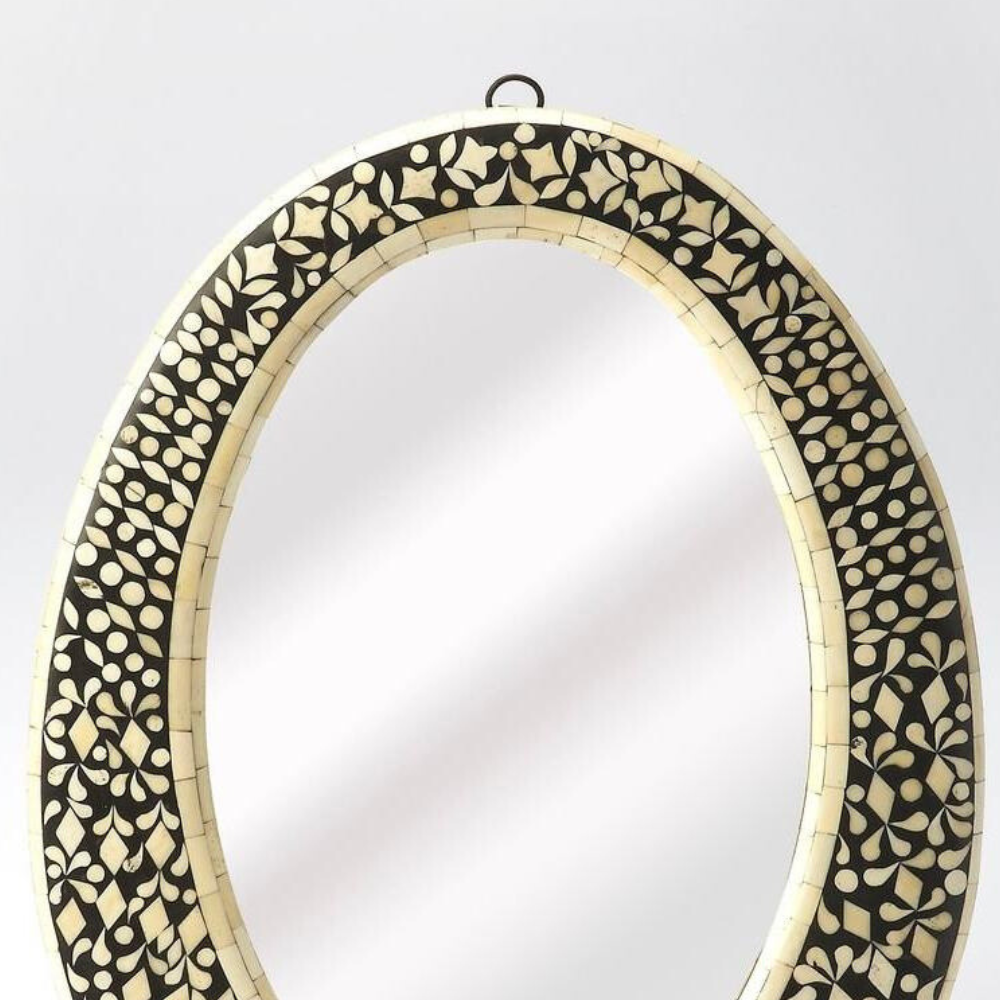 Bring a subtle pop of color to your space with this stylish accent mirror. Crafted of Mango wood solids and resin, this mirror strikes an oval silhouette. Its wide frame showcases a delicate bone-white floral inlay over a black background for a touch of bohemian chic, setting off the glass mirror within. This mirror arrives ready to hang right out of the box.