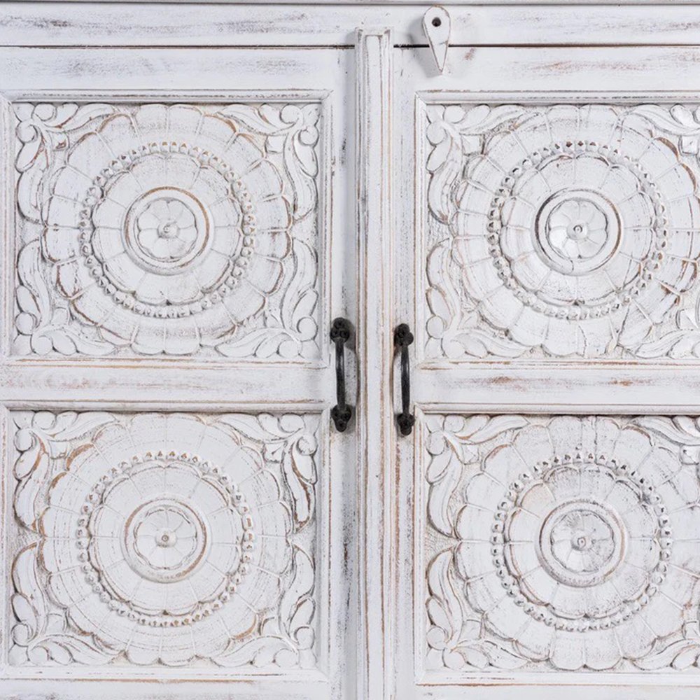 The Colia hand carving sideboard is Mediterranean and will be an eye-catcher in your living room, bedroom, or bathroom. With 4 compartments, it offers a lot of storage space. The four doors of the sideboard are richly decorated with floral colia ornaments.