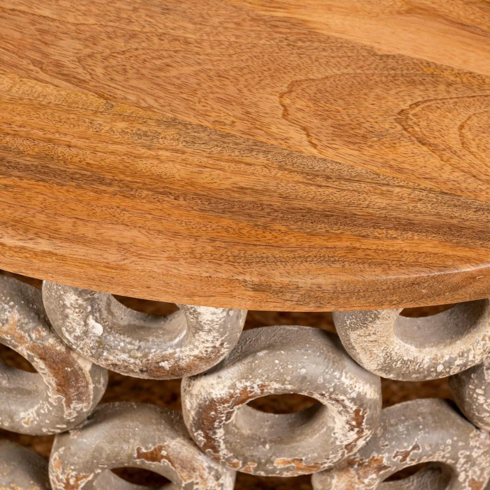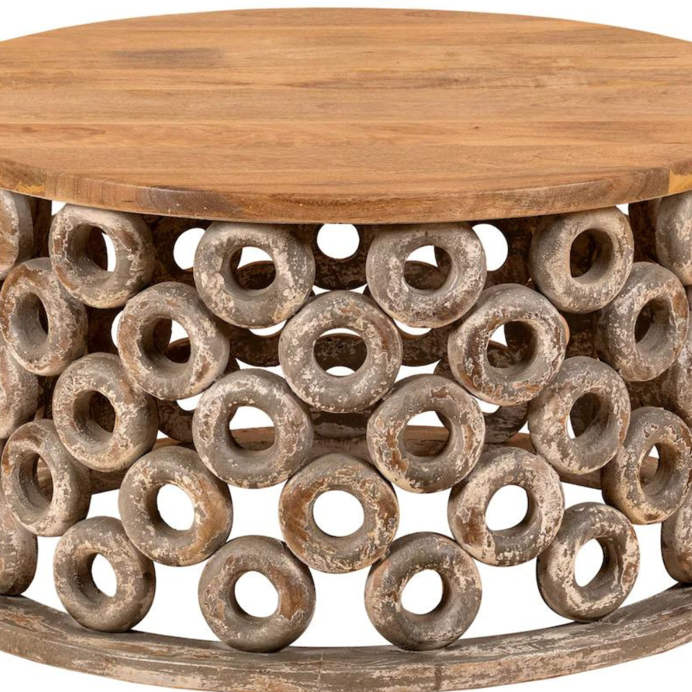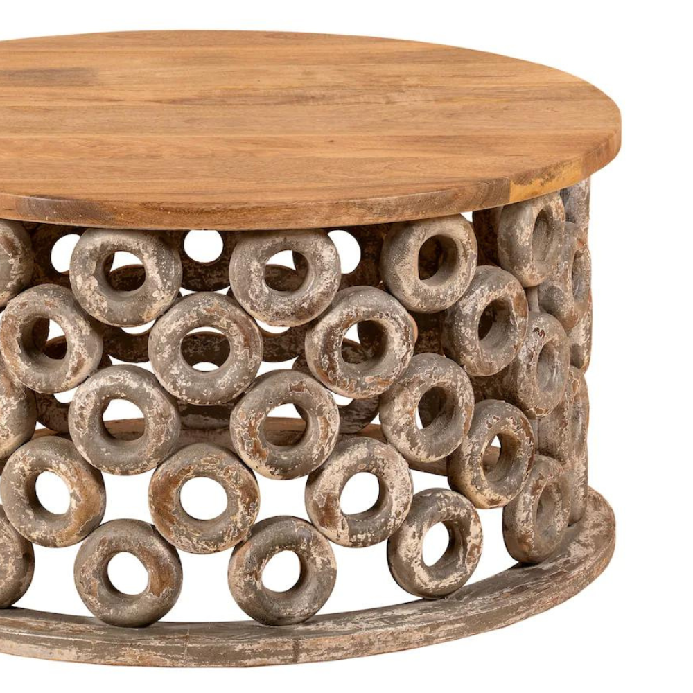 The entire table frame of the Harmony Haven Duxbury Hand-Carved Coffee Table is intricately carved with handmade patterns. The antique white colouring of the stand in contrast to the natural table top serves a classical as well as a modern design.