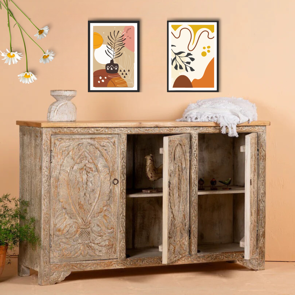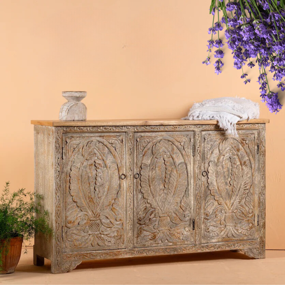 Introducing the handcrafted sideboard, where artistry meets practicality in a truly enchanting way. You’ll be captivated by the exquisite Indian handcrafted engravings that adorn this piece, each telling a story of tradition and culture, infusing your living space with a touch of India’s rich heritage. Its antique-wash surface adds a touch of rustic elegance, lending a vintage charm that suits any decor style, whether classic or contemporary. Elevate your space with the Ember, where Indian design and functionality come together beautifully.