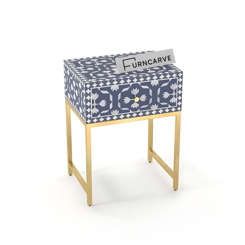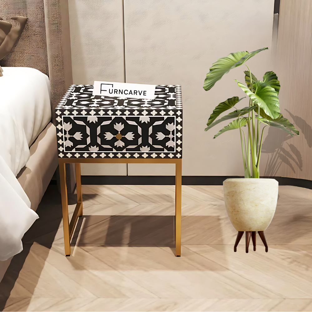 Bring the bone inlay trend into your bedroom with the Floral Bone Inlay Bedside Table, handcrafted by artisans in India using time-honored techniques. This bedside table would add glamour to any space with an intricate floral design, gold legs, and a handy drawer. It is a stunning piece and a work of art.