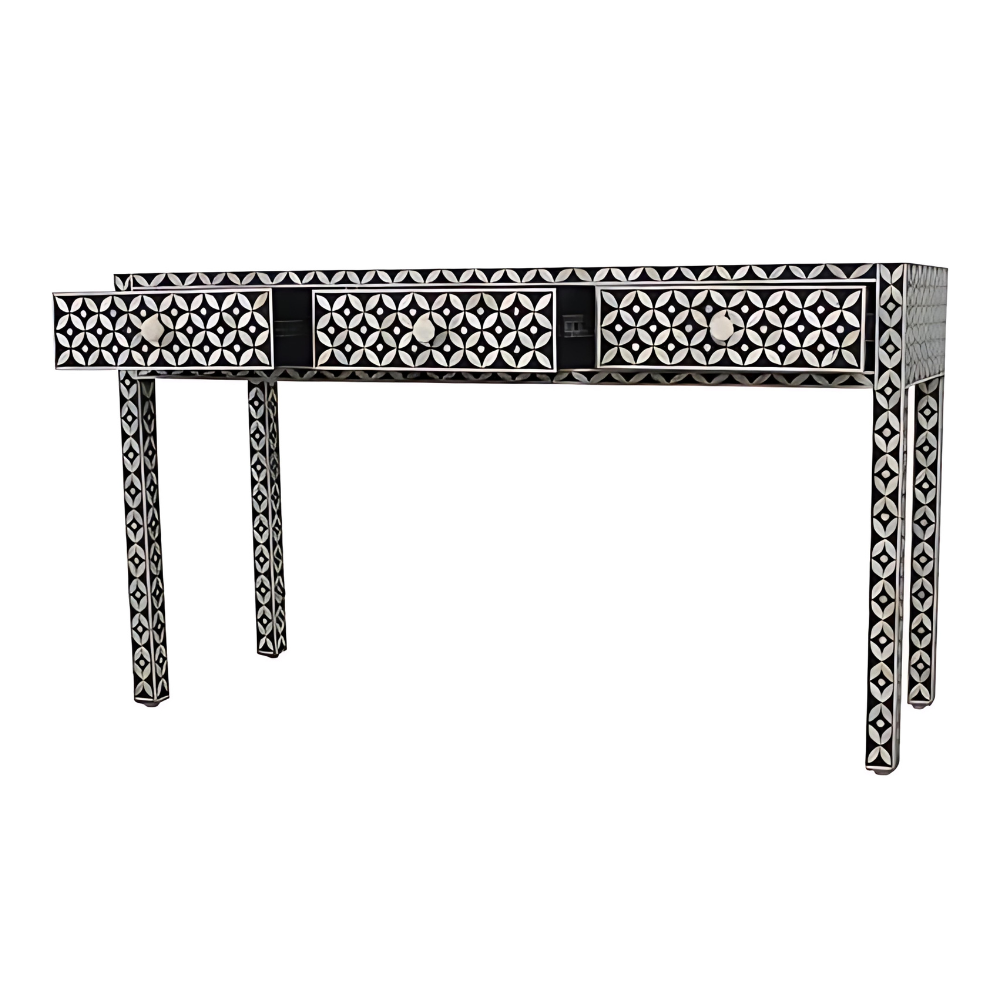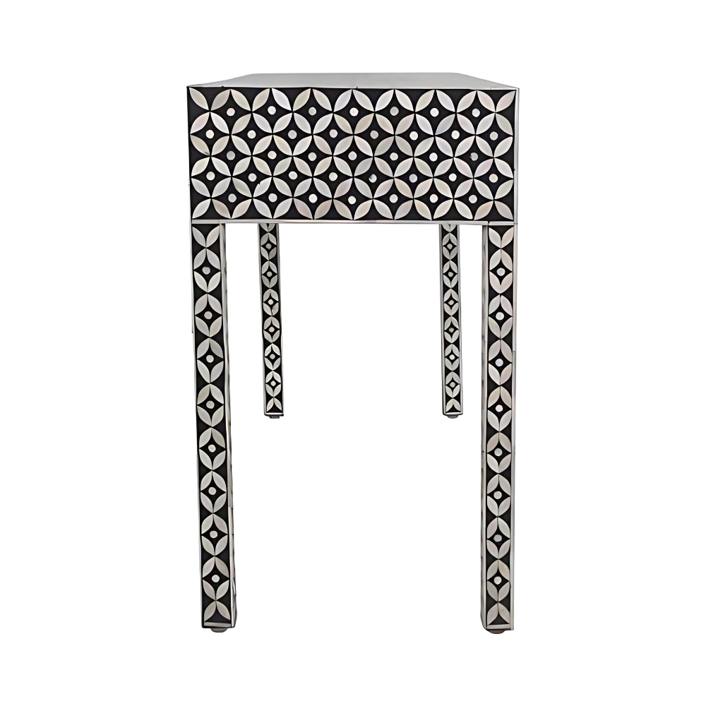 Define your entryway or anchor your living area with this bone-inlay console table in black geometric. Its elegance is guaranteed to radiate throughout the house and make a lasting impression.