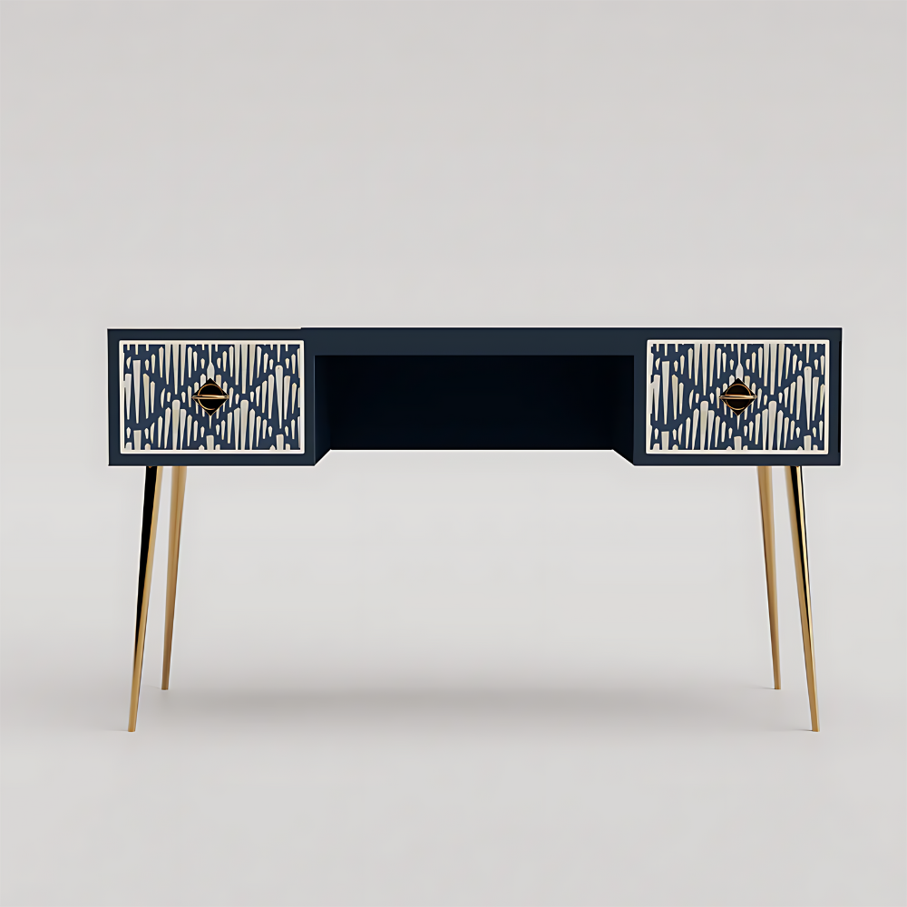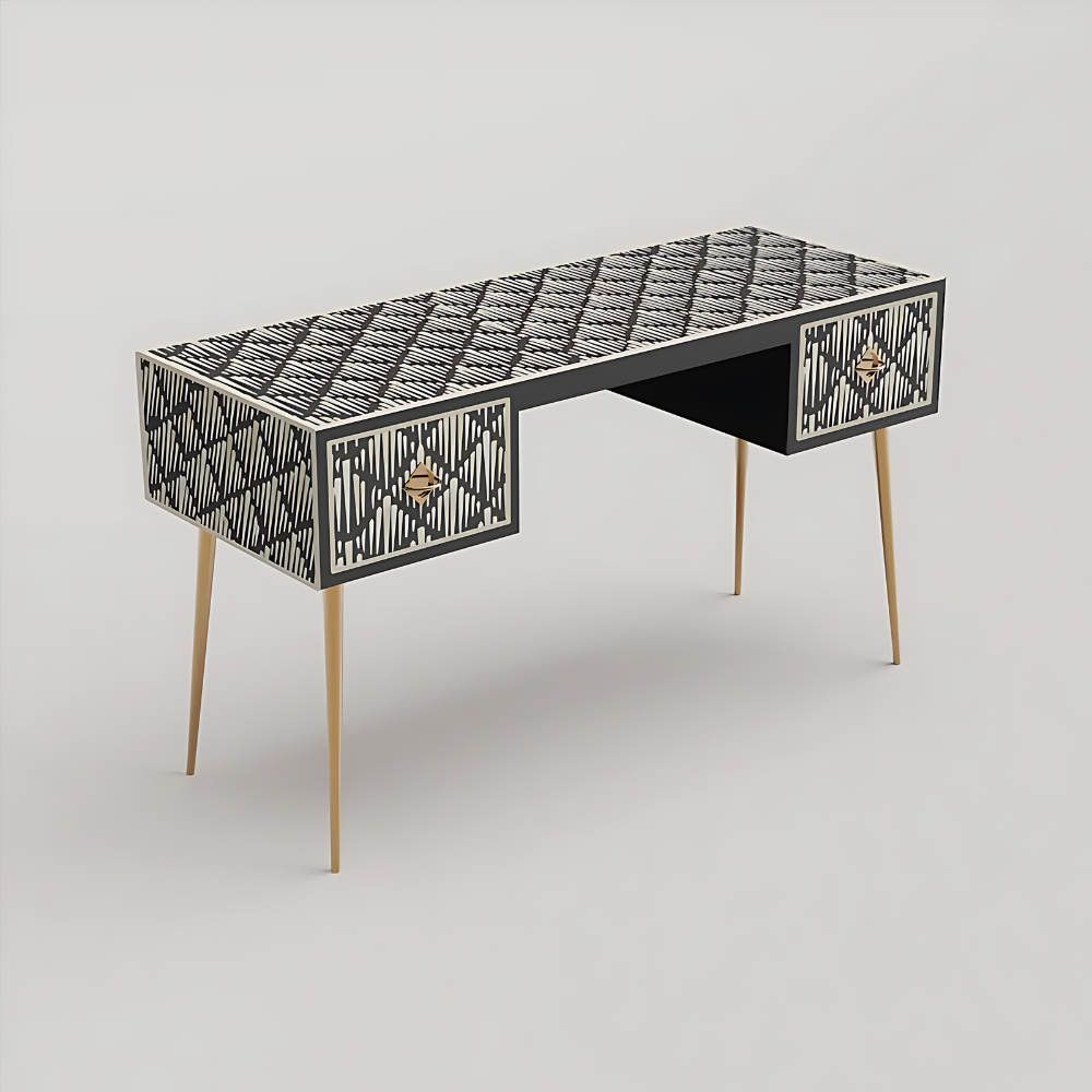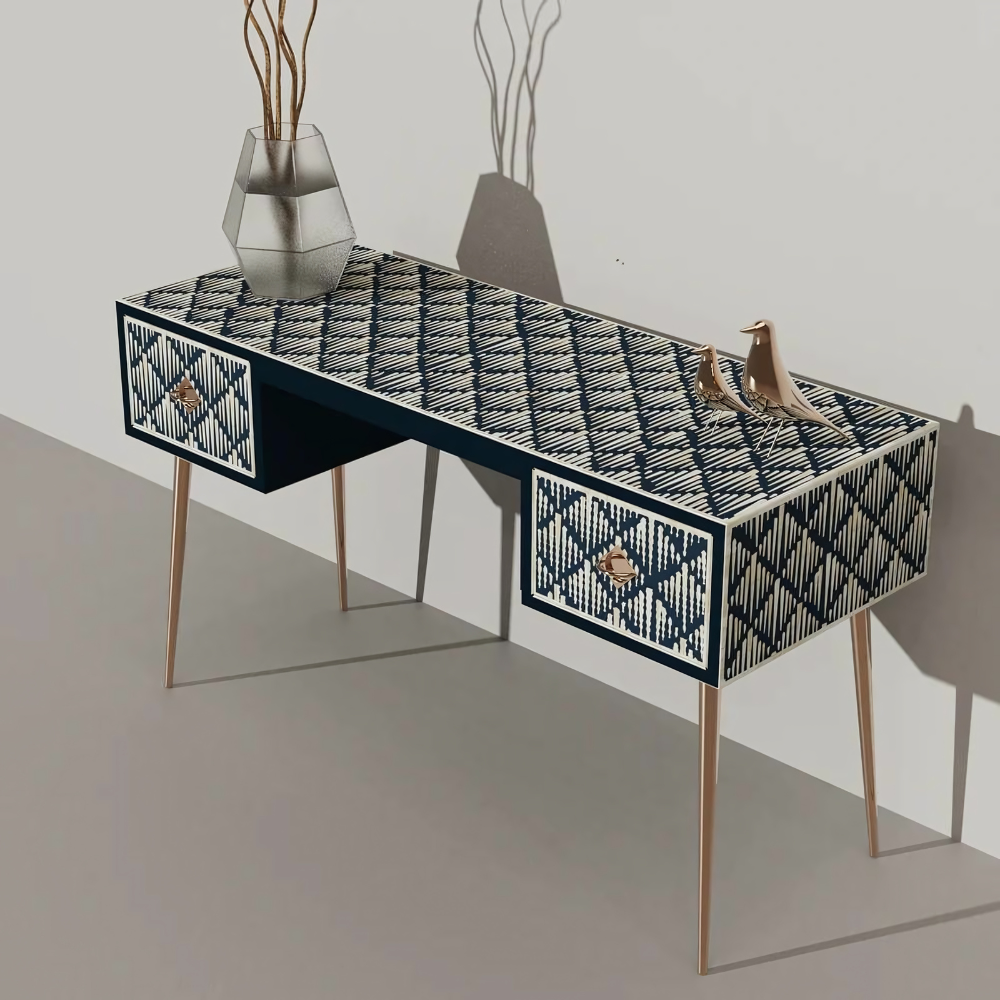 This geometric shape work desk exudes unparalleled craftsmanship. Artful and functional at once, this striking desk offers a petite perch and ample storage for productive work-from-home days. Each piece has been handcrafted in a process that can take weeks using honorably sourced Bone / Mother of Pearl. Delicately carved pieces of bone / MoP have been individually inlaid onto a wooden frame in an elaborate pattern. Layers of colored resin are then used to fill around the bone/mop. Finally, the backside and inside areas are painted with matching colors.