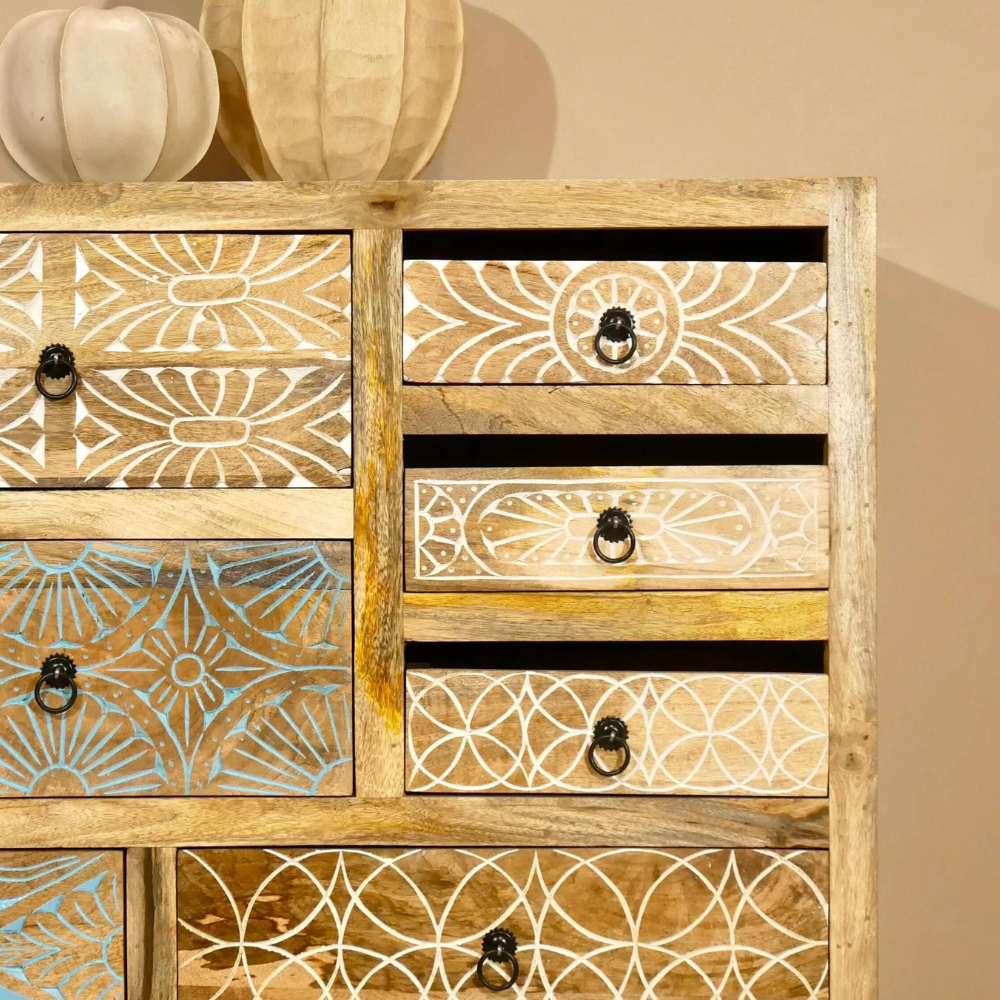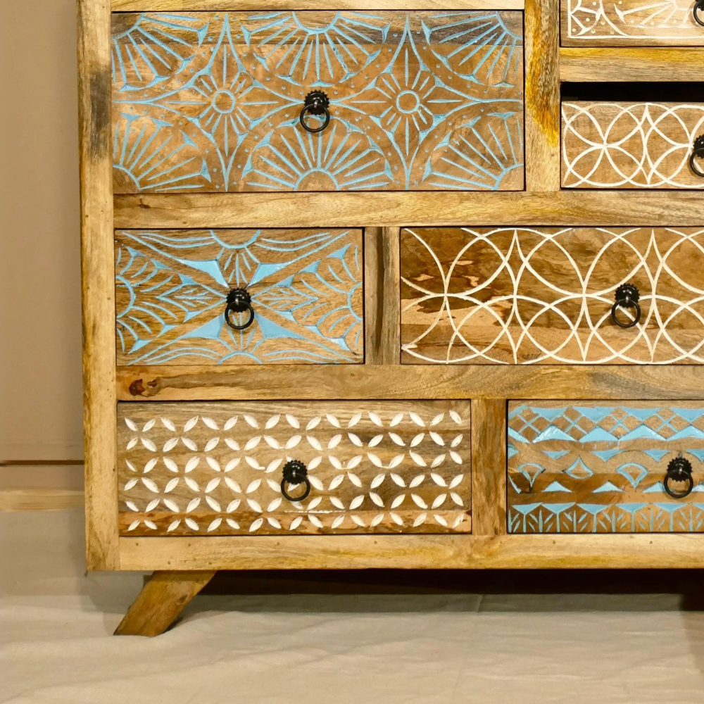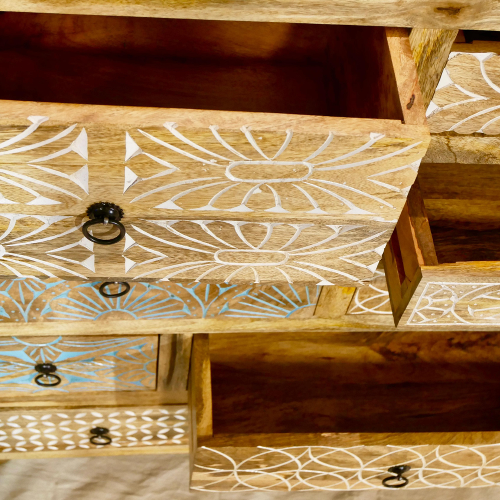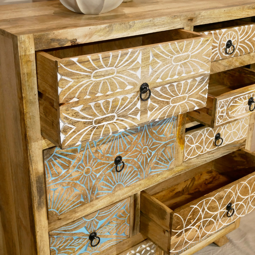 Grayson Chest of Drawers is Mediterranean and will be an eye-catcher in your living room, bedroom, or bathroom. With 6 large drawers, it offers plenty of storage space. The drawer fronts are richly decorated with Indian hand-carved carvings.