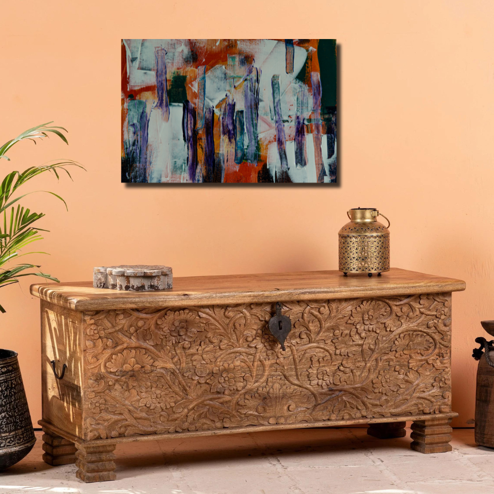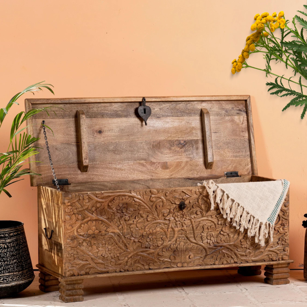 - Mango Wood: The unique Carved Trunk Box is made of solid Mango wood. Mango wood is more durable than many other woods and its texture shows diverse and unique color patterns.