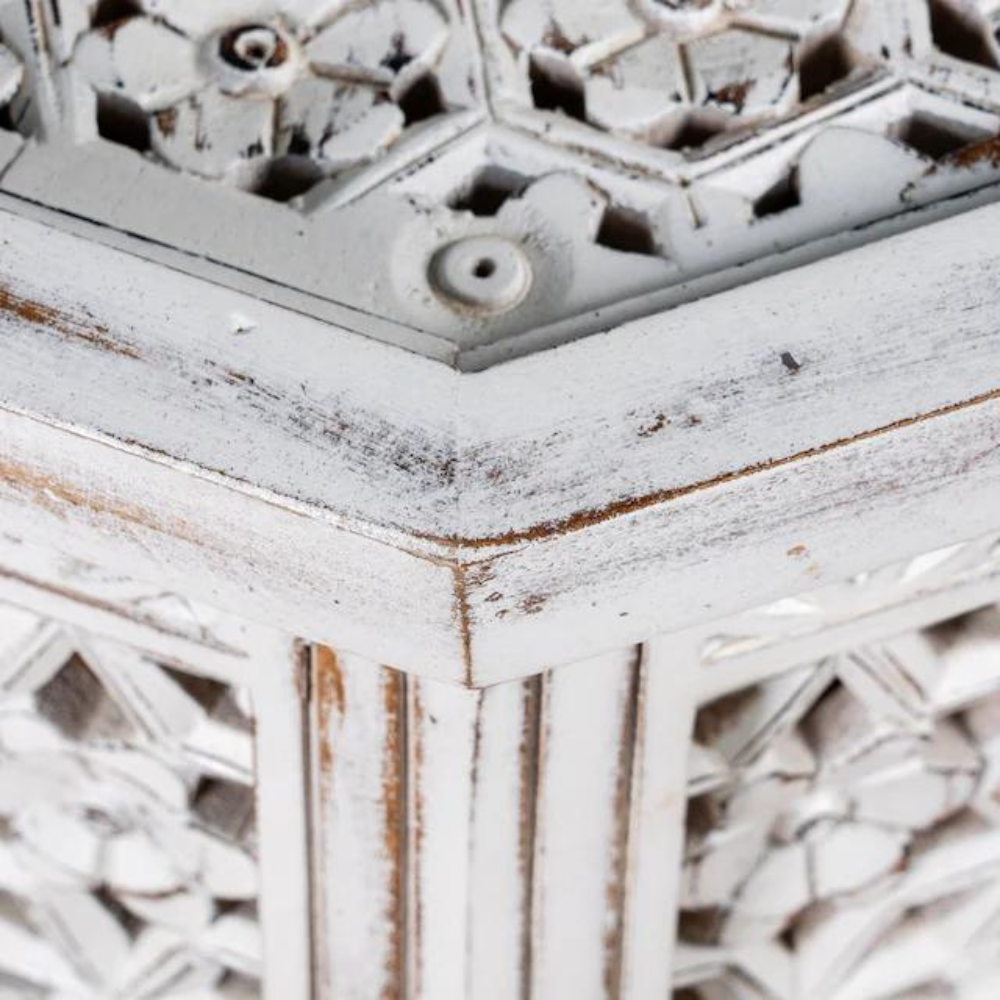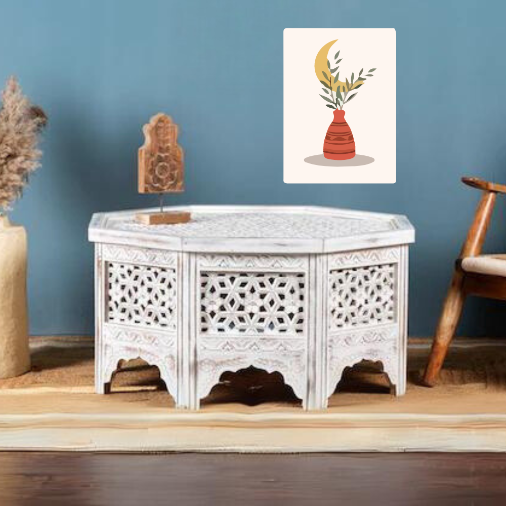 This exquisite octagonal table is a testament to the traditional art of Indian woodworking. Constructed from solid mango wood, it features panels that have been hand-carved with floral motifs, each detail reflecting the meticulous skill of its creator. The table has been finished with honey wax, which protects the wood and gives it a lustrous sheen, accentuating the natural beauty of the mango wood’s grain and the carved designs. It’s a functional piece of furniture that doesn’t compromise style, ideal for adding a touch of organic elegance to any living space.