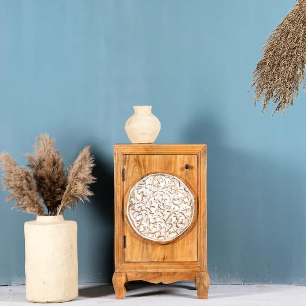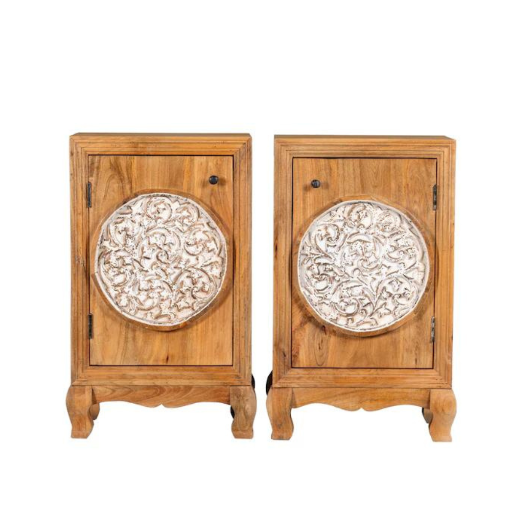 Discover the natural beauty and craftsmanship of our mango wood side table Orchid. The entire front is adorned with intricate hand-carved flower motifs, creating a connection to nature and infusing any room with a warm, organic atmosphere.