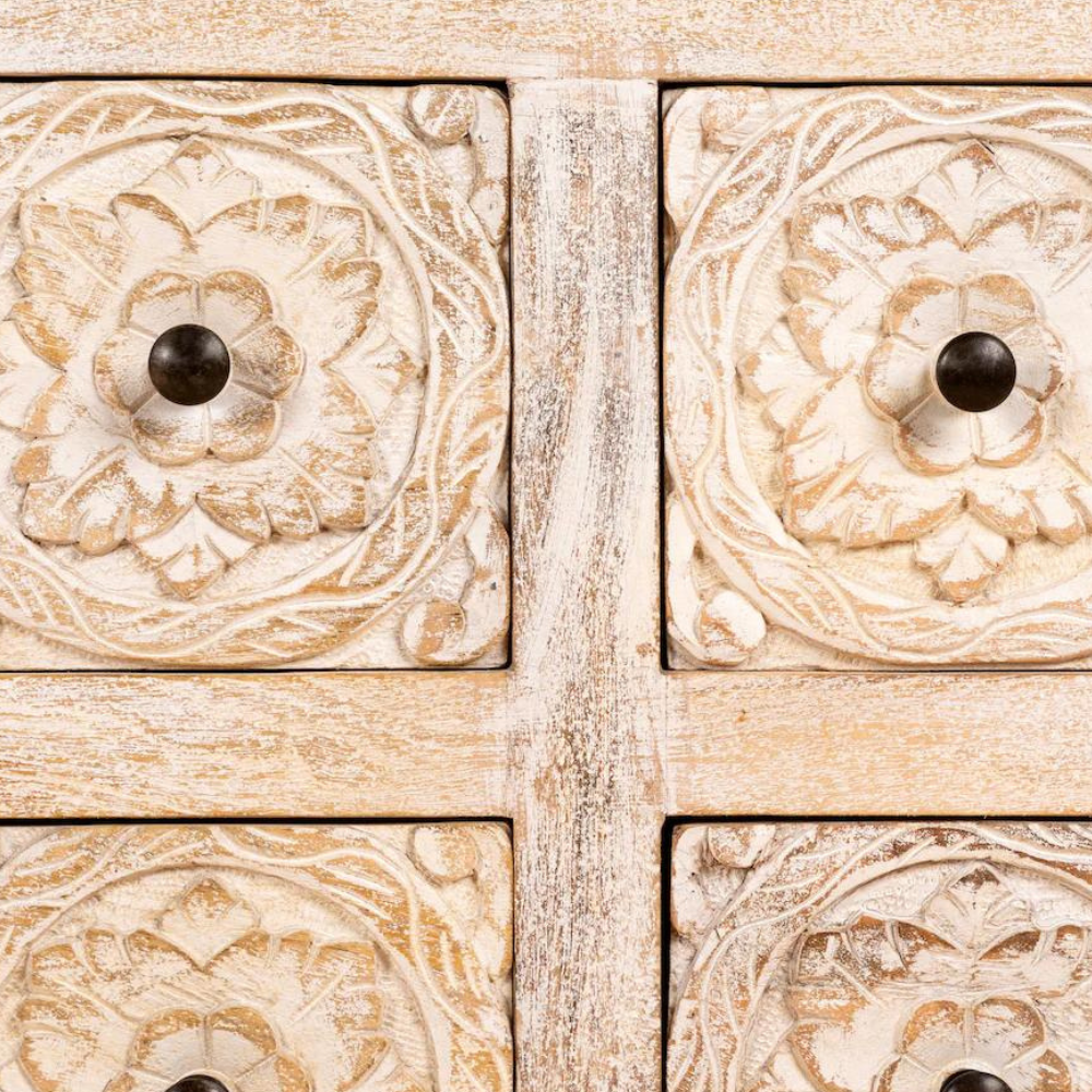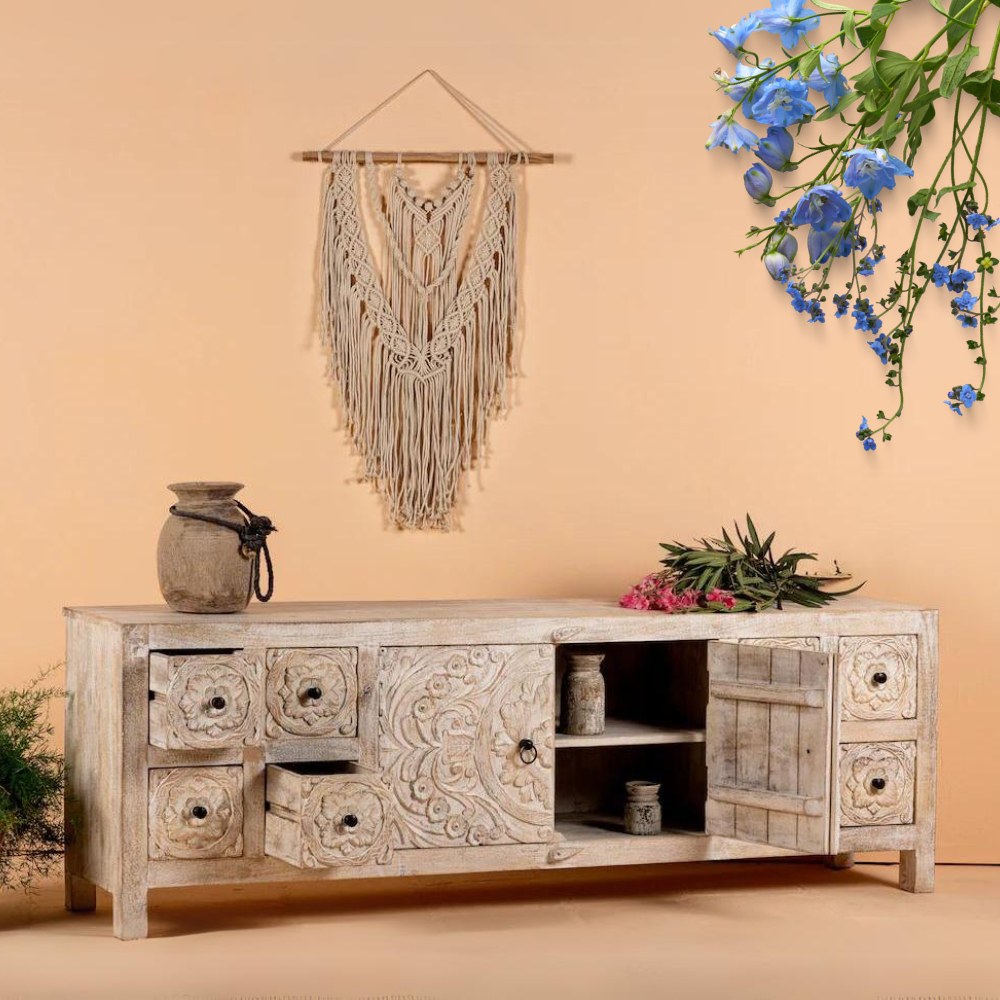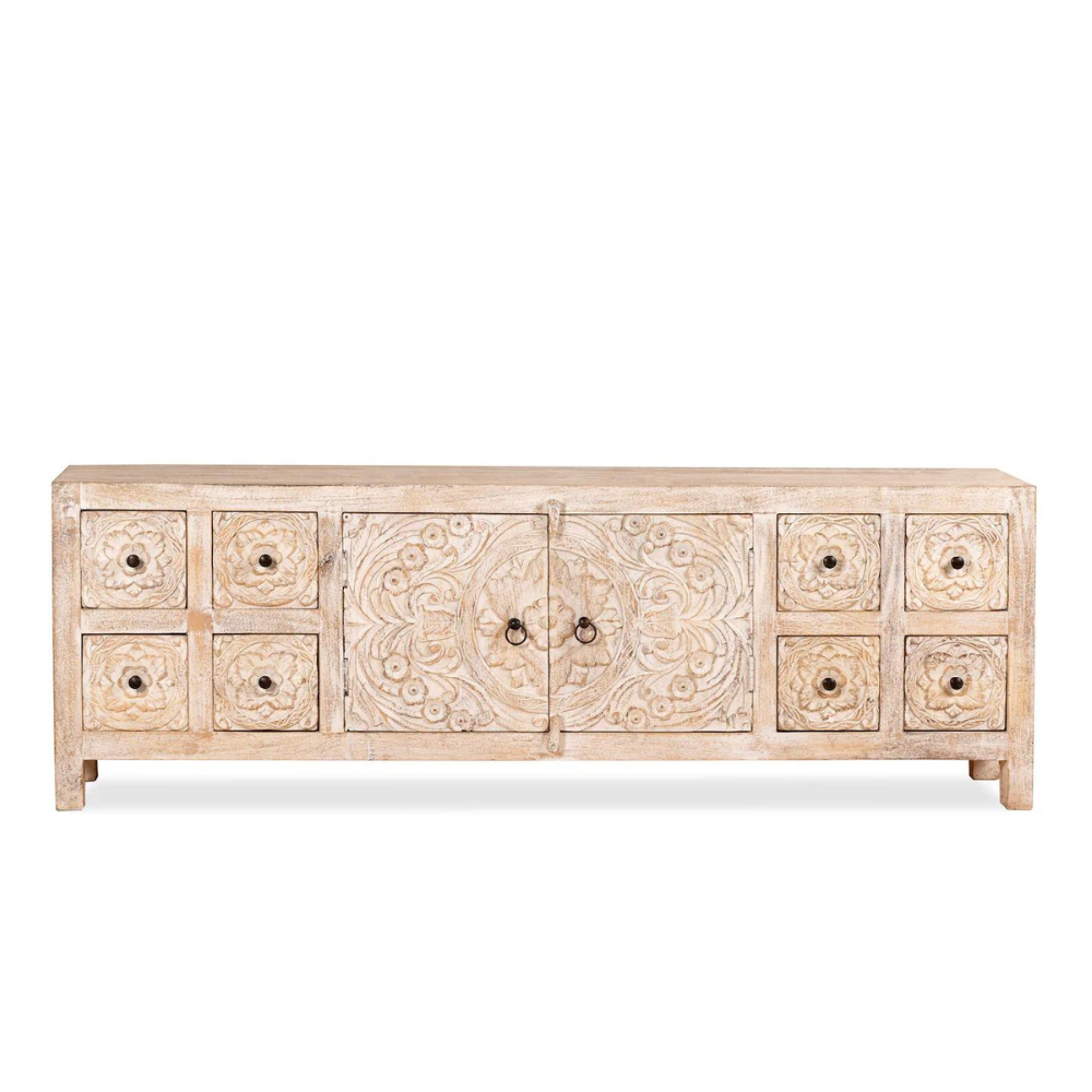 Discover the TV cabinet, a beautiful piece of furniture made from mango wood. Its soft white-washed color adds a touch of sophistication to your living space. What makes it truly special are the hand-carved engravings that decorate its surface, showcasing the incredible craftsmanship of Indian artisans. This TV cabinet not only offers practicality but also brings a sense of timeless elegance to your home. Elevate your decor with the TV cabinet, a unique fusion of style and artistry that reflects India’s rich design heritage.