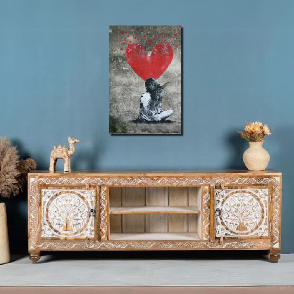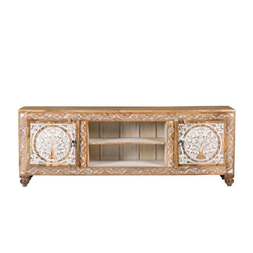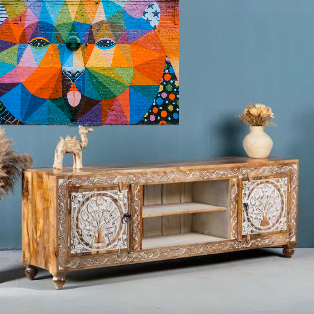 Discover our stunning lowboard Tree Style made from Mango wood, featuring elaborately hand-carved floral designs adorning the entire front. The natural tones of the Mango wood create a striking contrast to the intricately highlighted carvings, accentuated by a white wash finish.