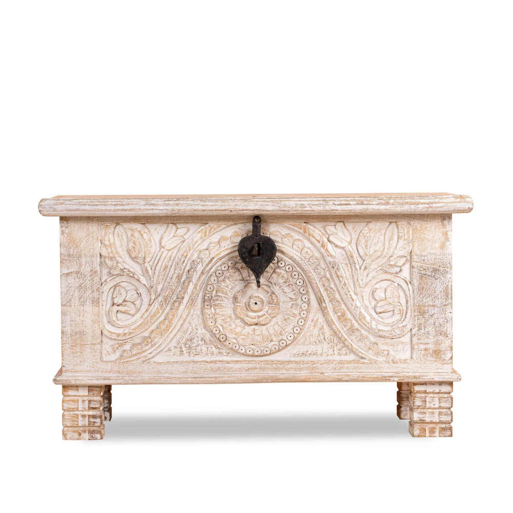 Exotic Hand Carved Wilson White Distressed Trunk Box