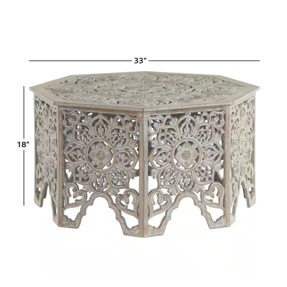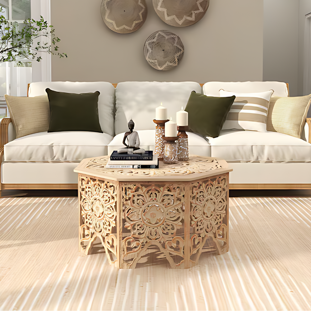 Introducing the Eternal Classics Hand Carved Wooden Octagon Coffee Table, a timeless fusion of traditional craftsmanship and enduring elegance. Meticulously handcrafted by skilled artisans, this coffee table is a testament to the beauty of artisanal woodworking.