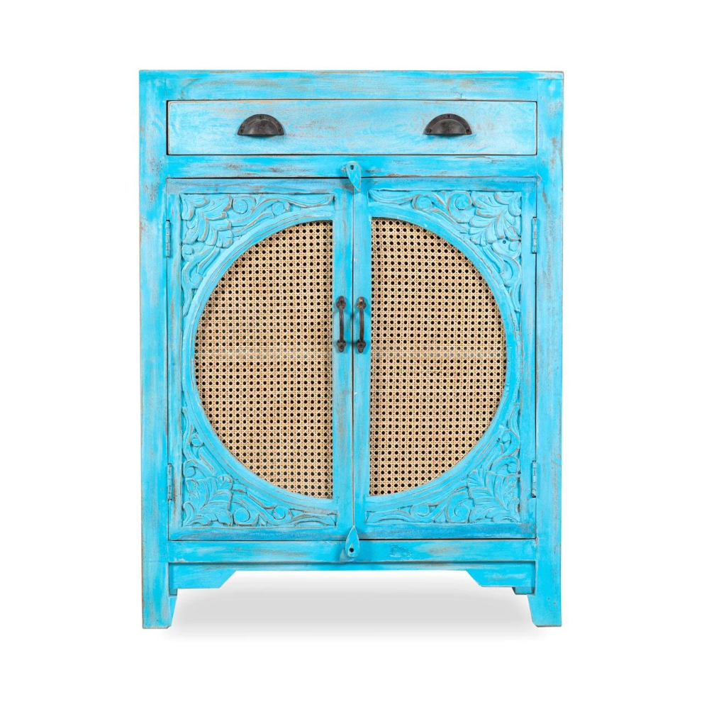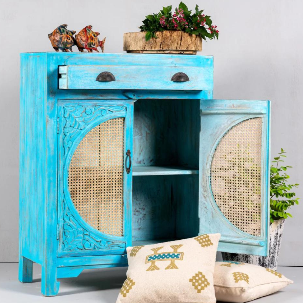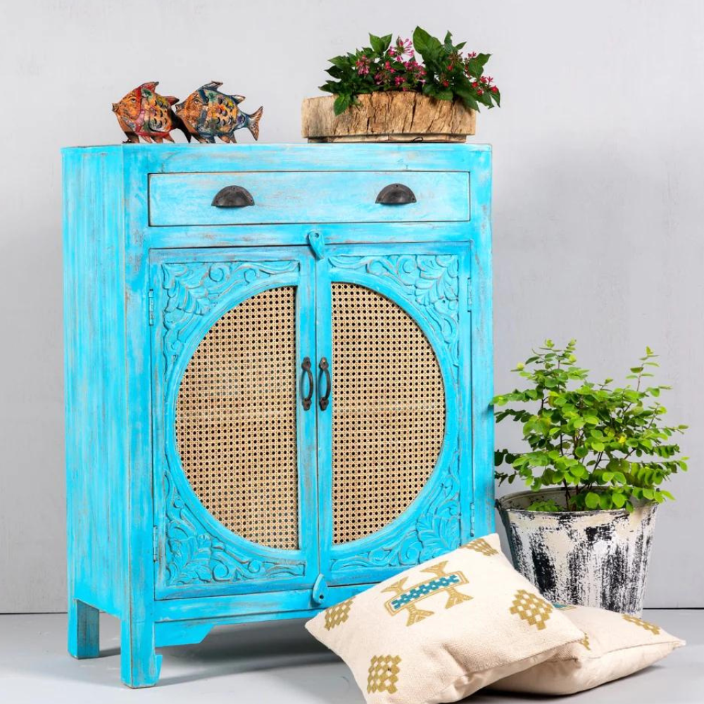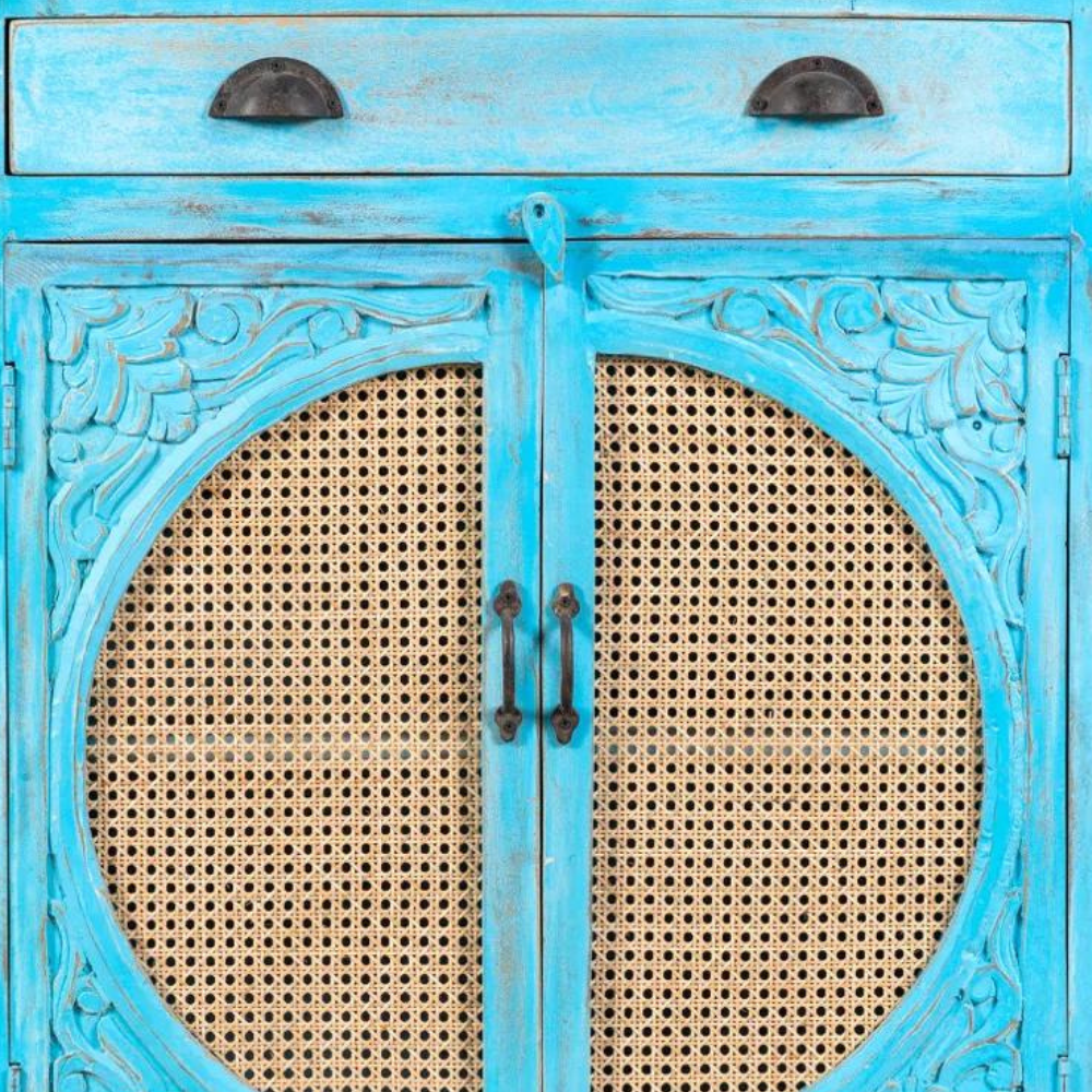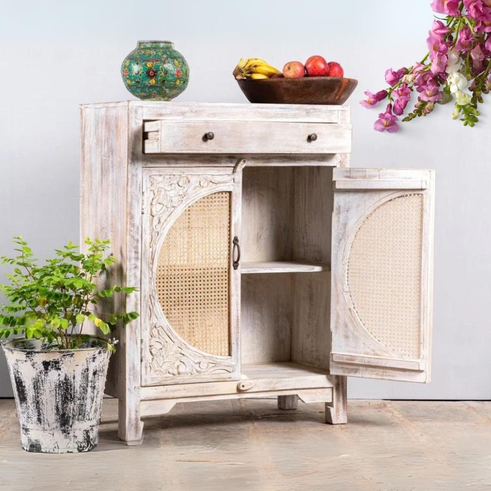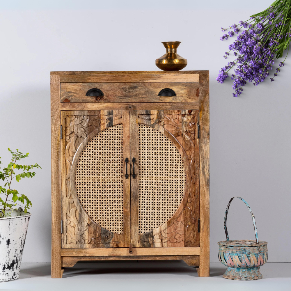 The Corbey Cabinet is a unique piece of furniture that enhances the art of Indian craftsmanship with a touch of Scandinavian furnishing style by integrating rattan materials into the mango wooden furniture body.
