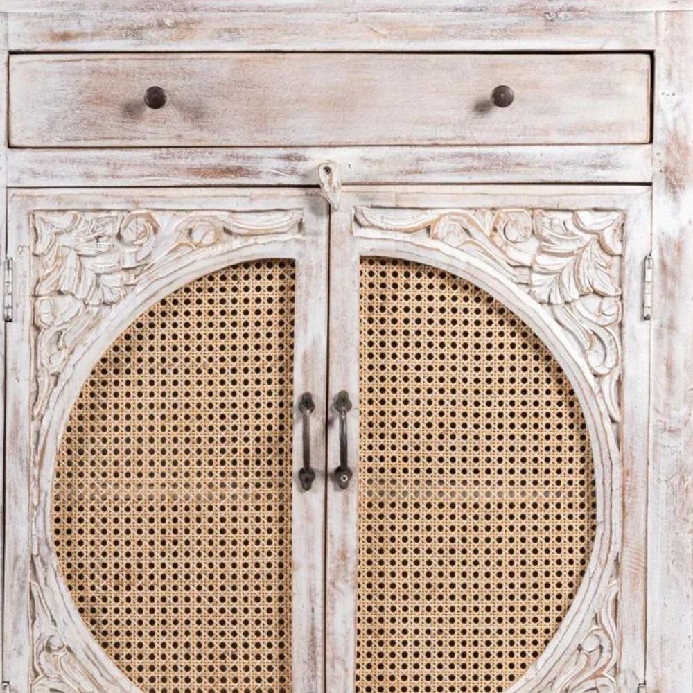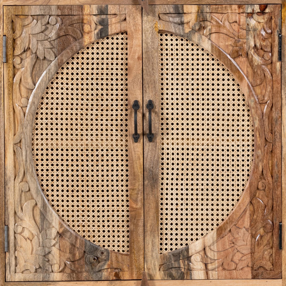 The rattan doors are encircled by fine Indian hand-carved ornaments.