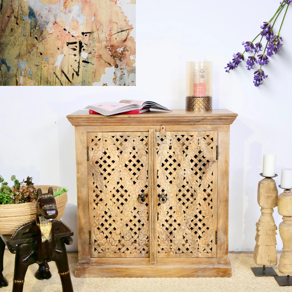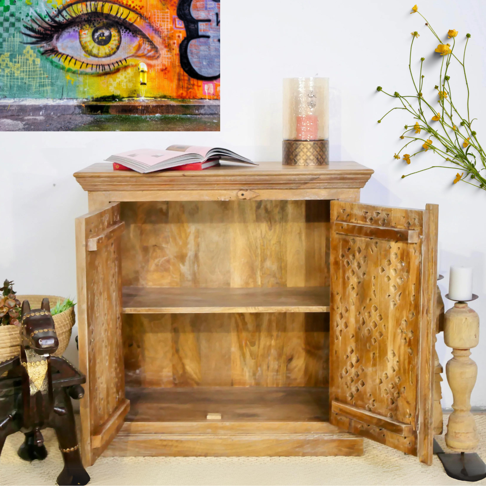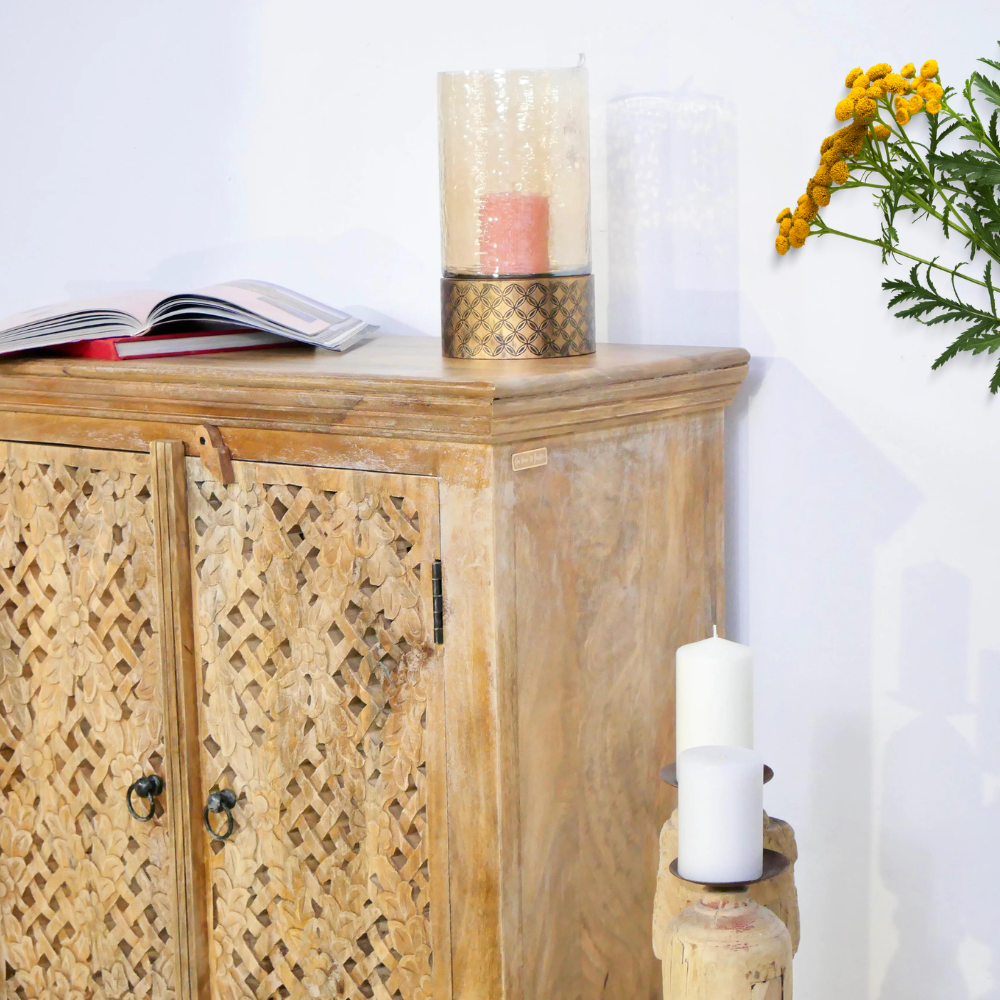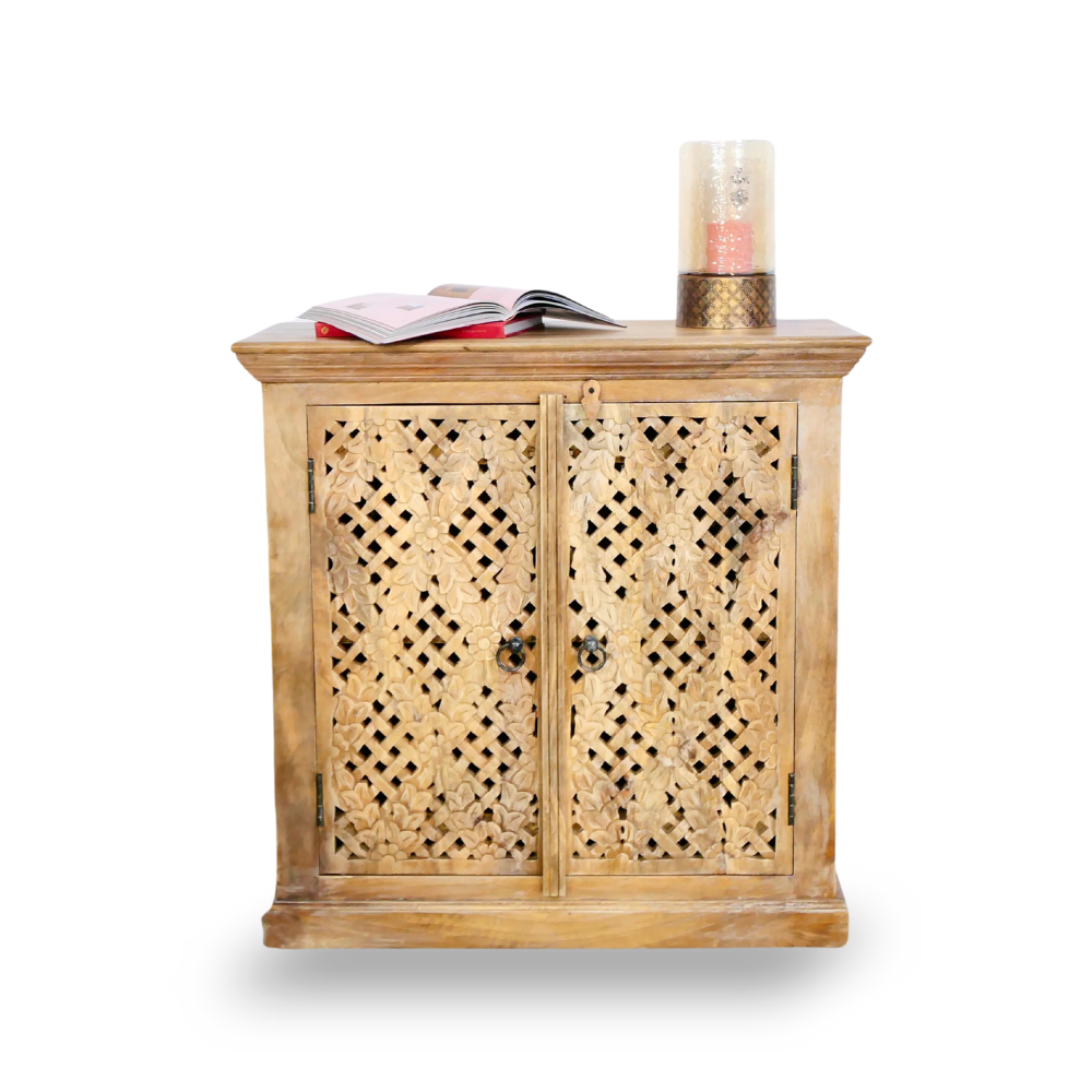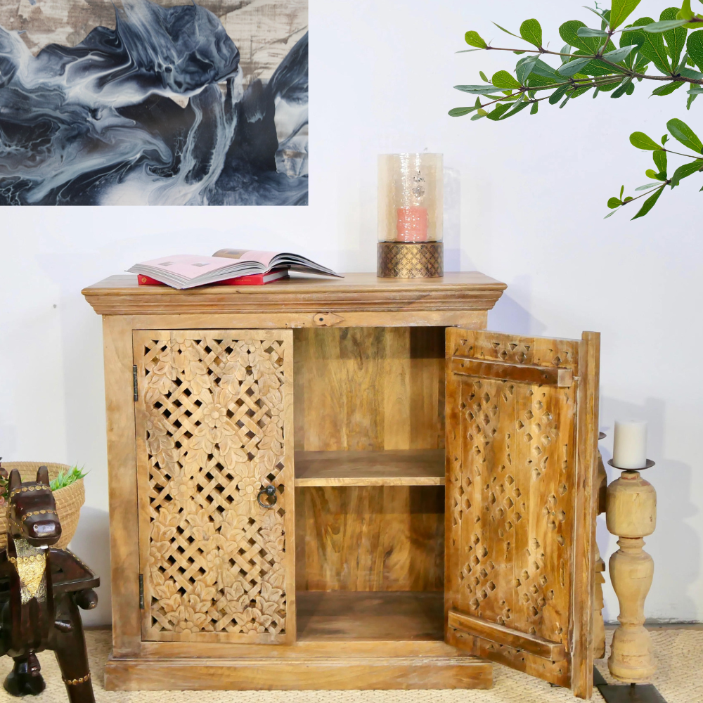 Our Floral cabinet is Mediterranean and will be an eye-catcher in your living room, bedroom, or bathroom. With its 2 large compartments, it offers a lot of storage space. The doors are richly decorated with Indian hand-carved carvings.