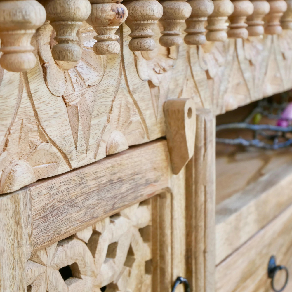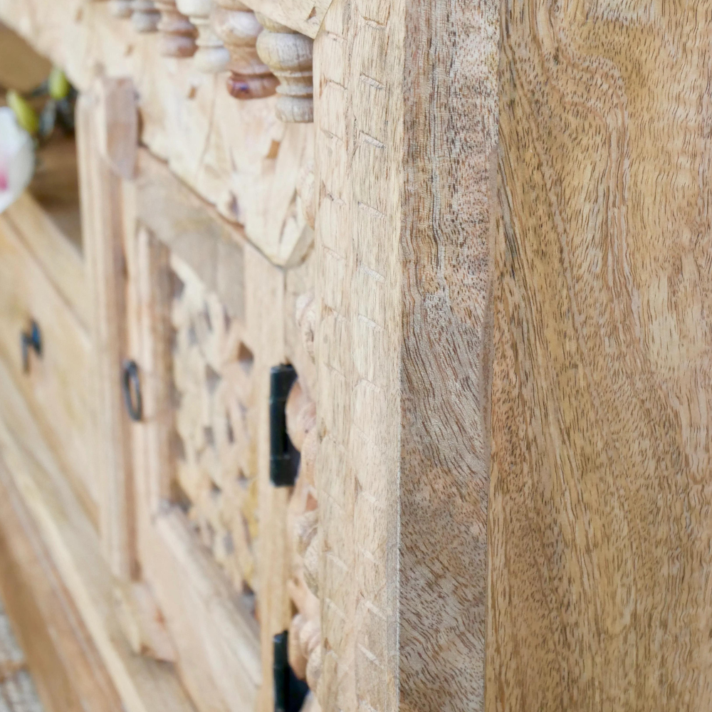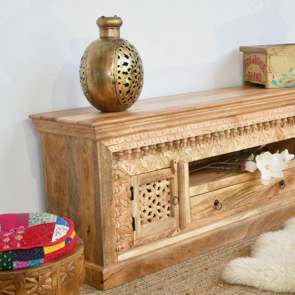The Hanoi TV Cabinet with Drawer is Mediterranean and will be an eye-catcher in your living room, bedroom, or bathroom. Its 2 drawers and two compartments offer plenty of storage space. The doors are richly decorated with Indian hand-carved carvings.