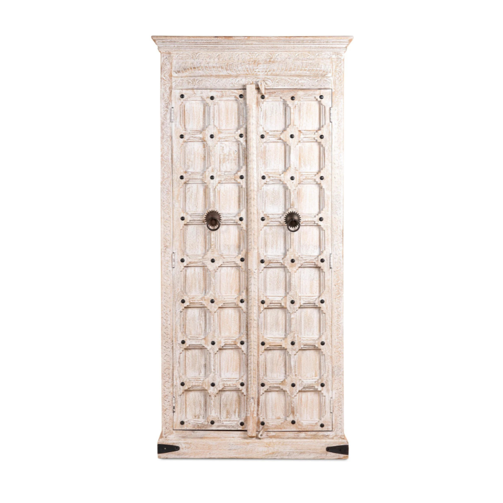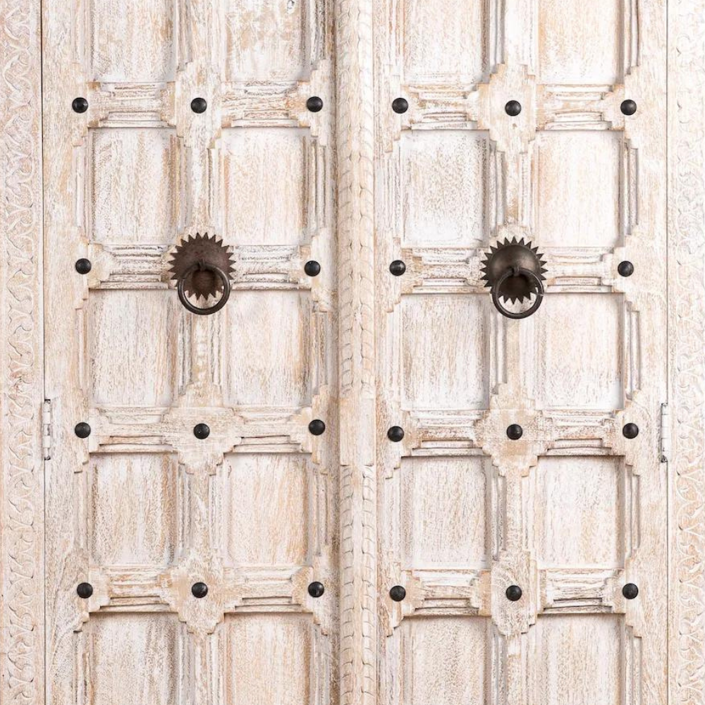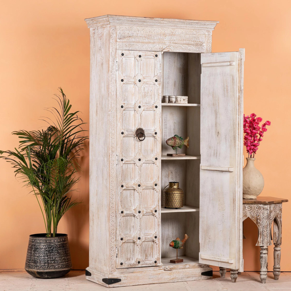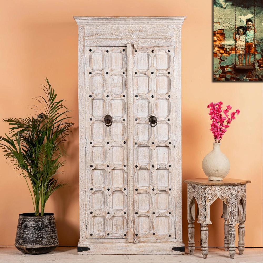Introducing “Heb,” a magnificent Indian handcrafted wardrobe that exudes timeless elegance and grandeur. With its majestic doors and white-washed body, this wardrobe is a statement piece that effortlessly blends traditional craftsmanship with modern aesthetics.