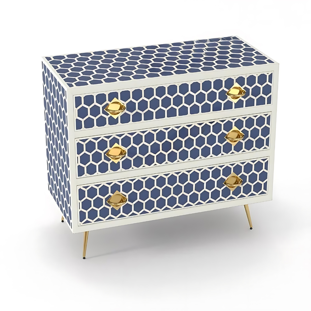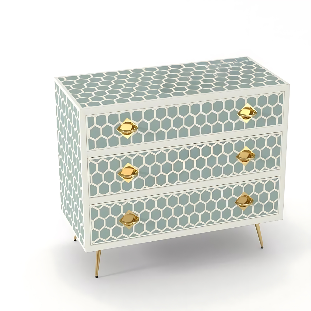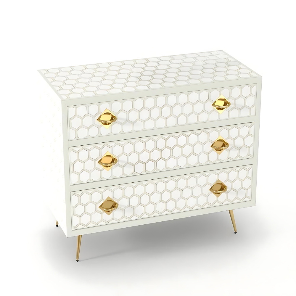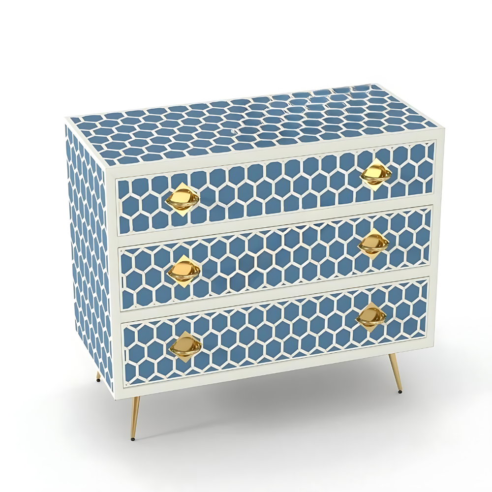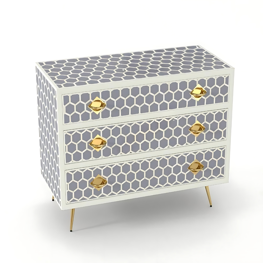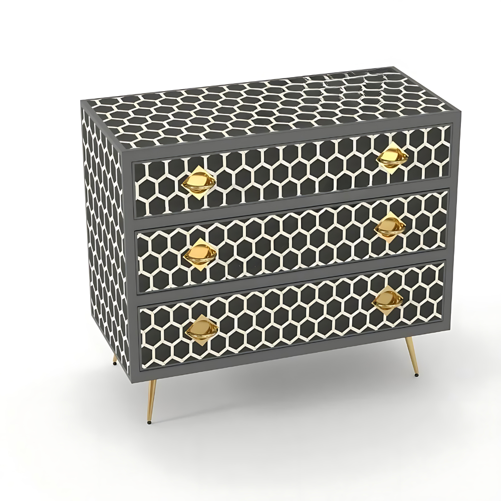 Introducing our exquisite three-drawer dresser adorned with the honeycomb pattern by Furncarve. This luxurious piece not only adds functionality to your bedroom but also enhances its aesthetic appeal with its captivating design. Handcrafted using meticulously sourced materials, each delicate honeycomb is intricately overlaid onto a wooden frame, creating a stunning visual effect. The careful layering of colored resin further accentuates the beauty of the honeycomb pattern, making it a true masterpiece. With its versatile design, this dresser offers ample storage space for accessories, clothes, makeup, and more, while adding a touch of elegance to any room.