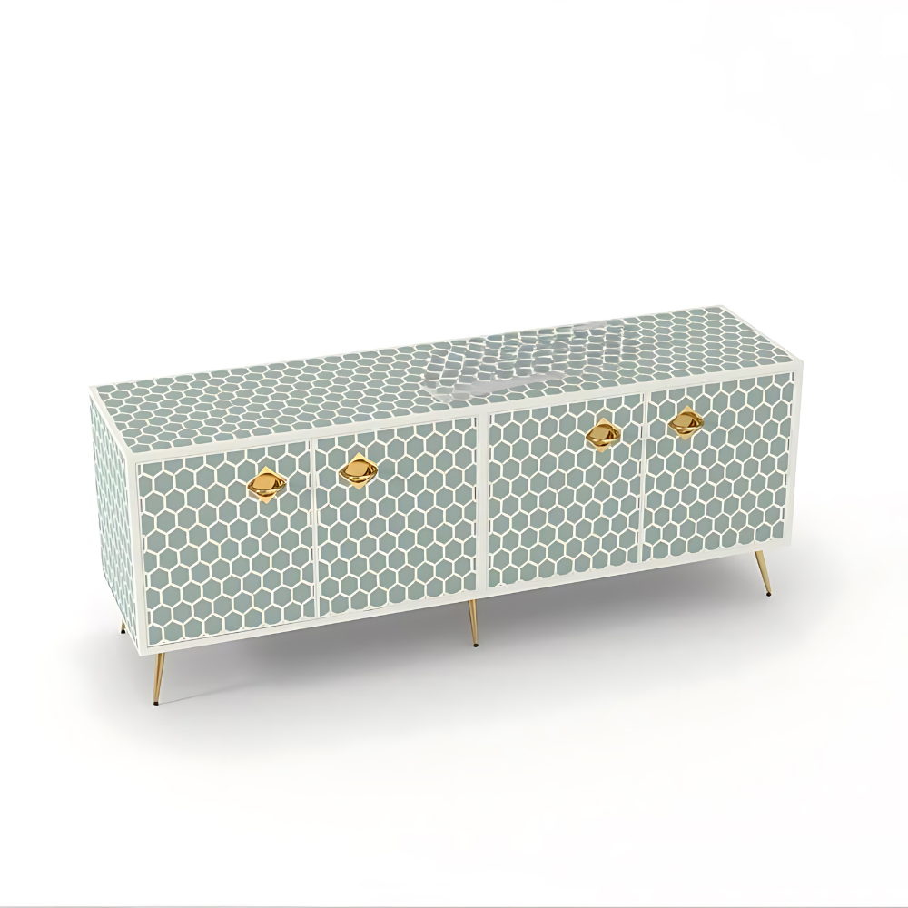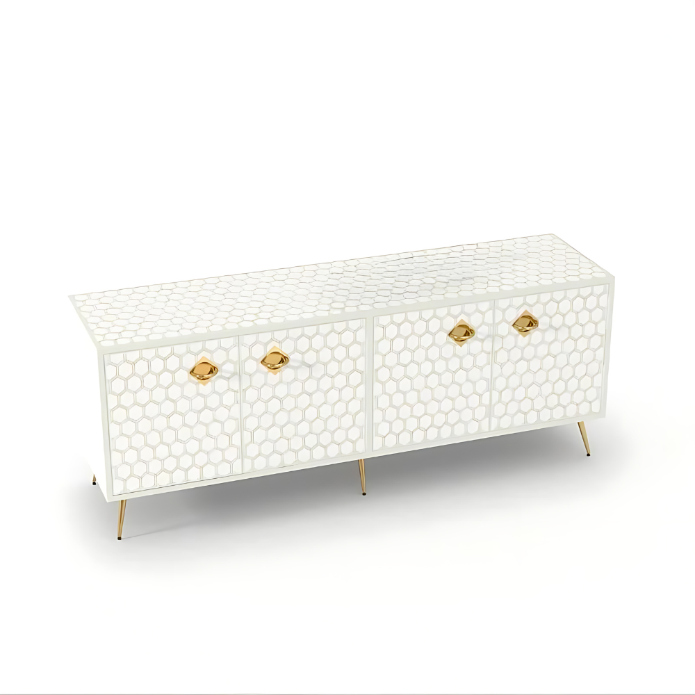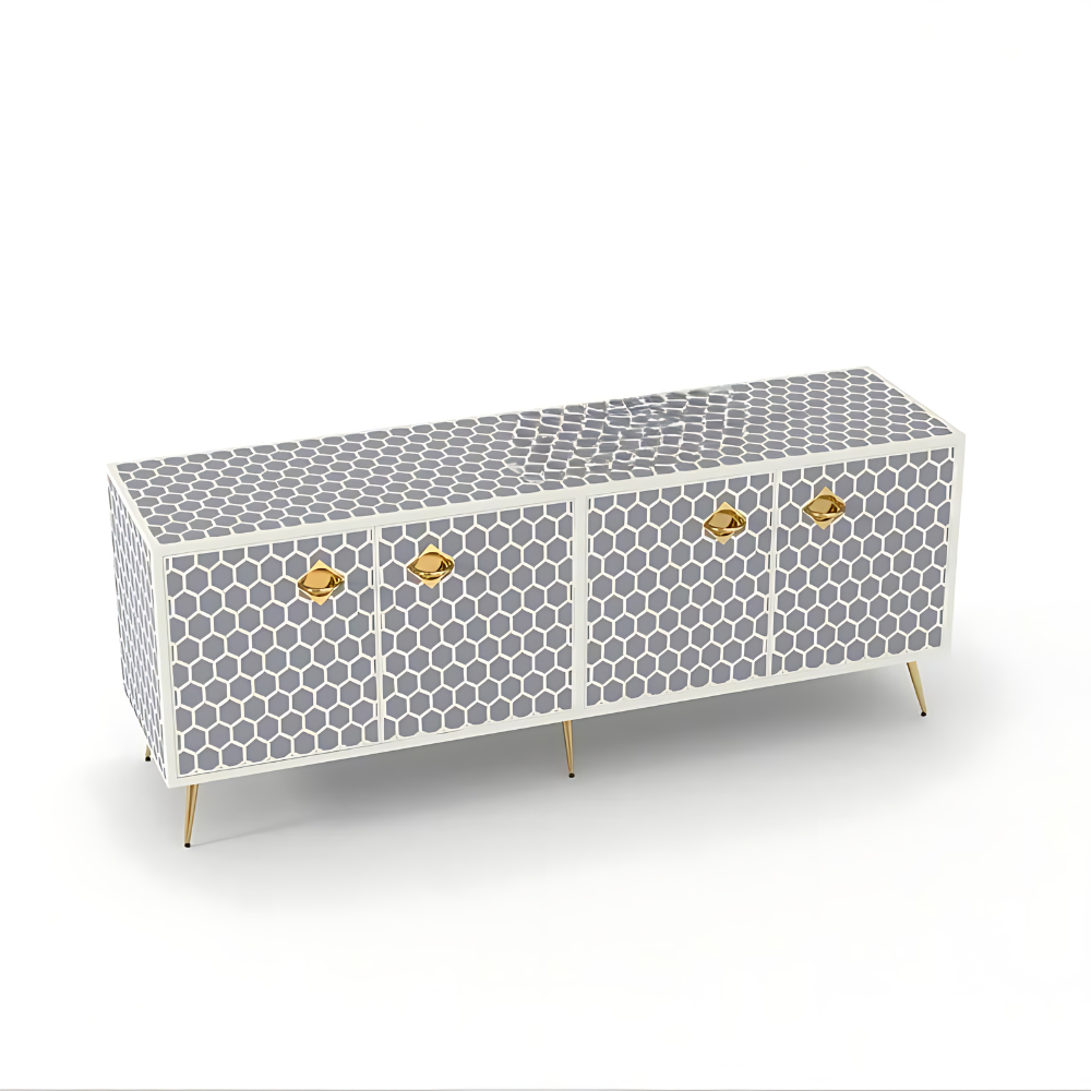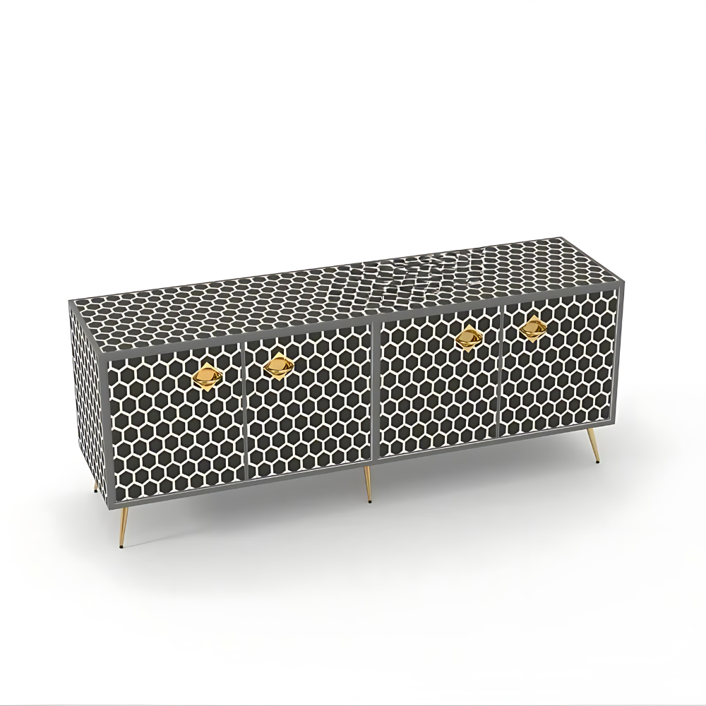 Elevate your living space with our Honeycomb Inlay Design TV Cabinet—an exceptional addition that exudes sophistication and adds a touch of luxury to any room.