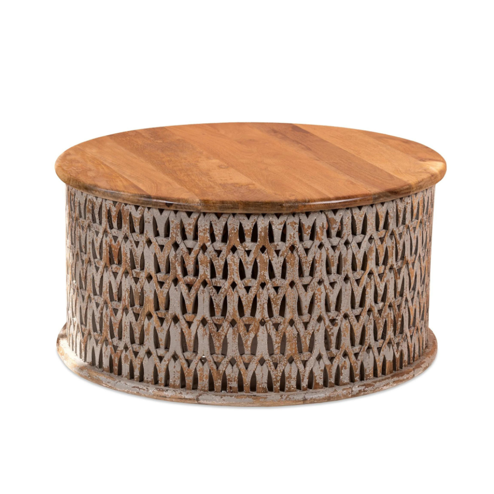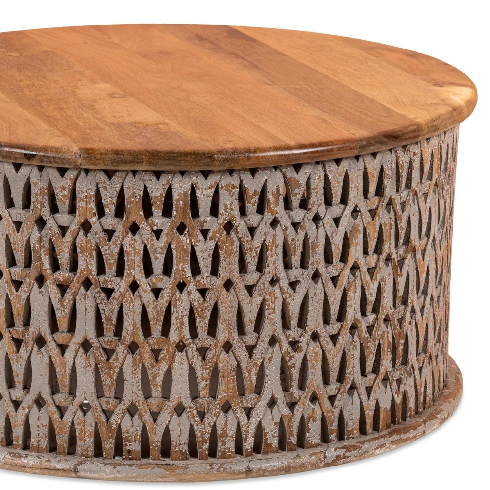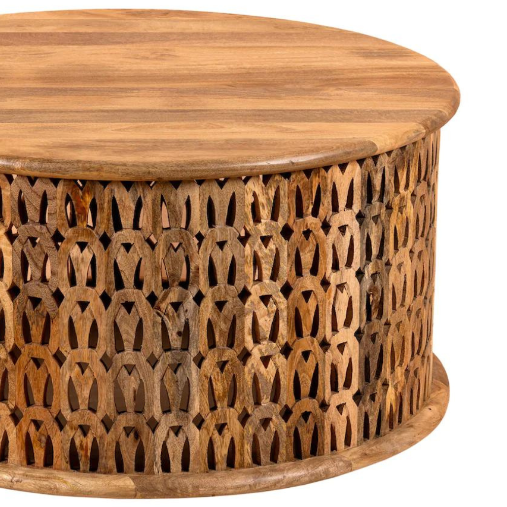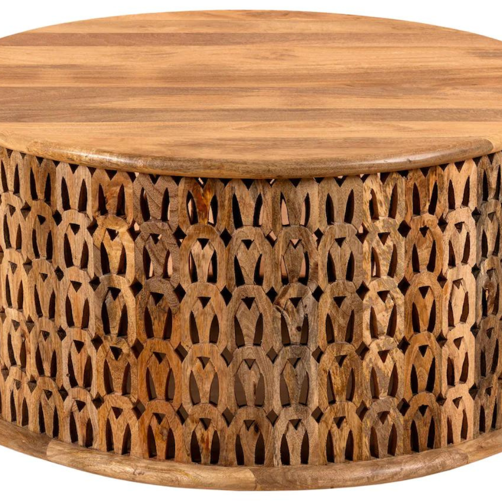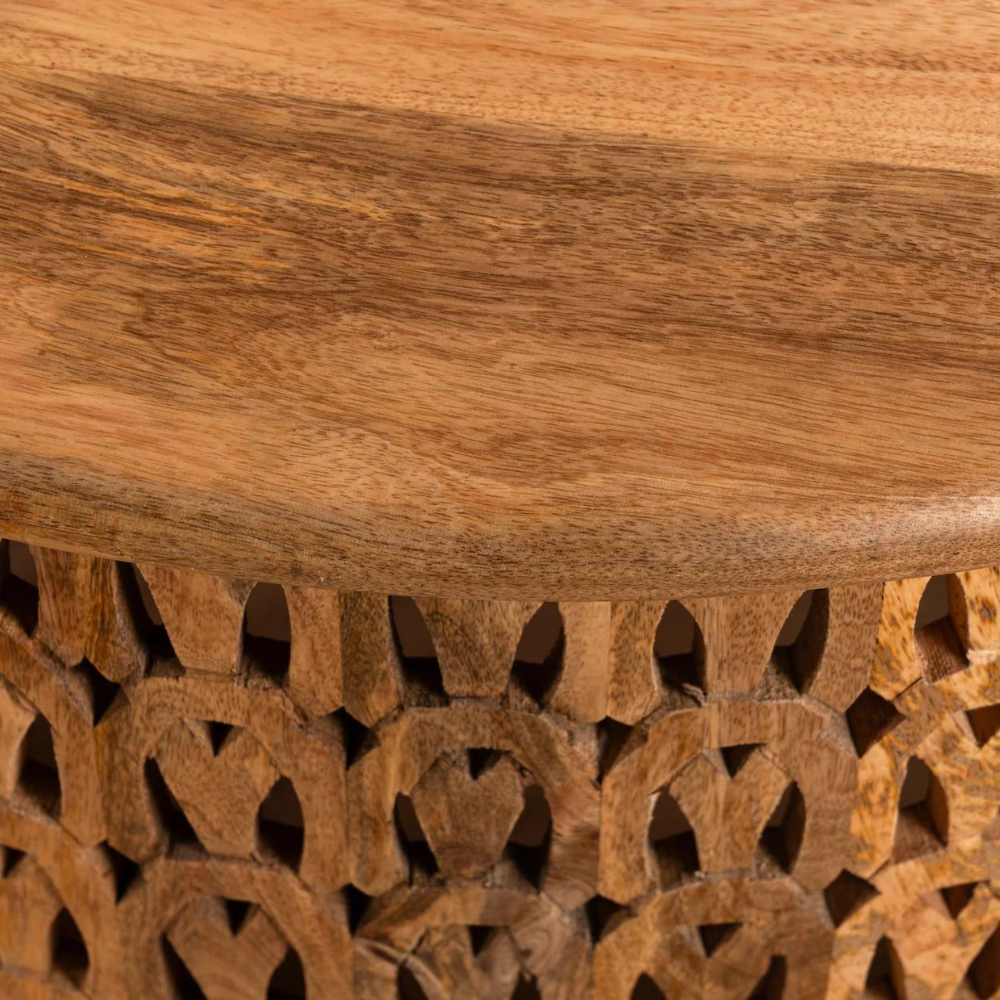 Meet the “Linon” coffee table: crafted from beautiful mango wood, this table features a charming round design that brings an air of sophistication to any room. Its surface is adorned with intricate engravings that highlight India’s rich artistic heritage. The “Linon” coffee table is the perfect centerpiece for any living room and infuses warmth and character into your home.