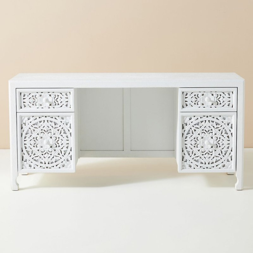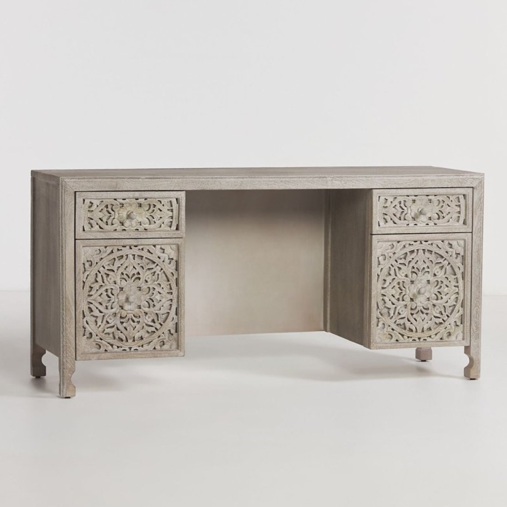 Hand-carved Lombok Executive Desk for Home Office from tropical hardwood, this elegant desk is a timeless work of art and a beautiful centerpiece for a home office or workspace. The intricacy of its filigree-inspired cutouts creates lively shadow play that’s enhanced especially when placed near a sunny window and cast with natural light.