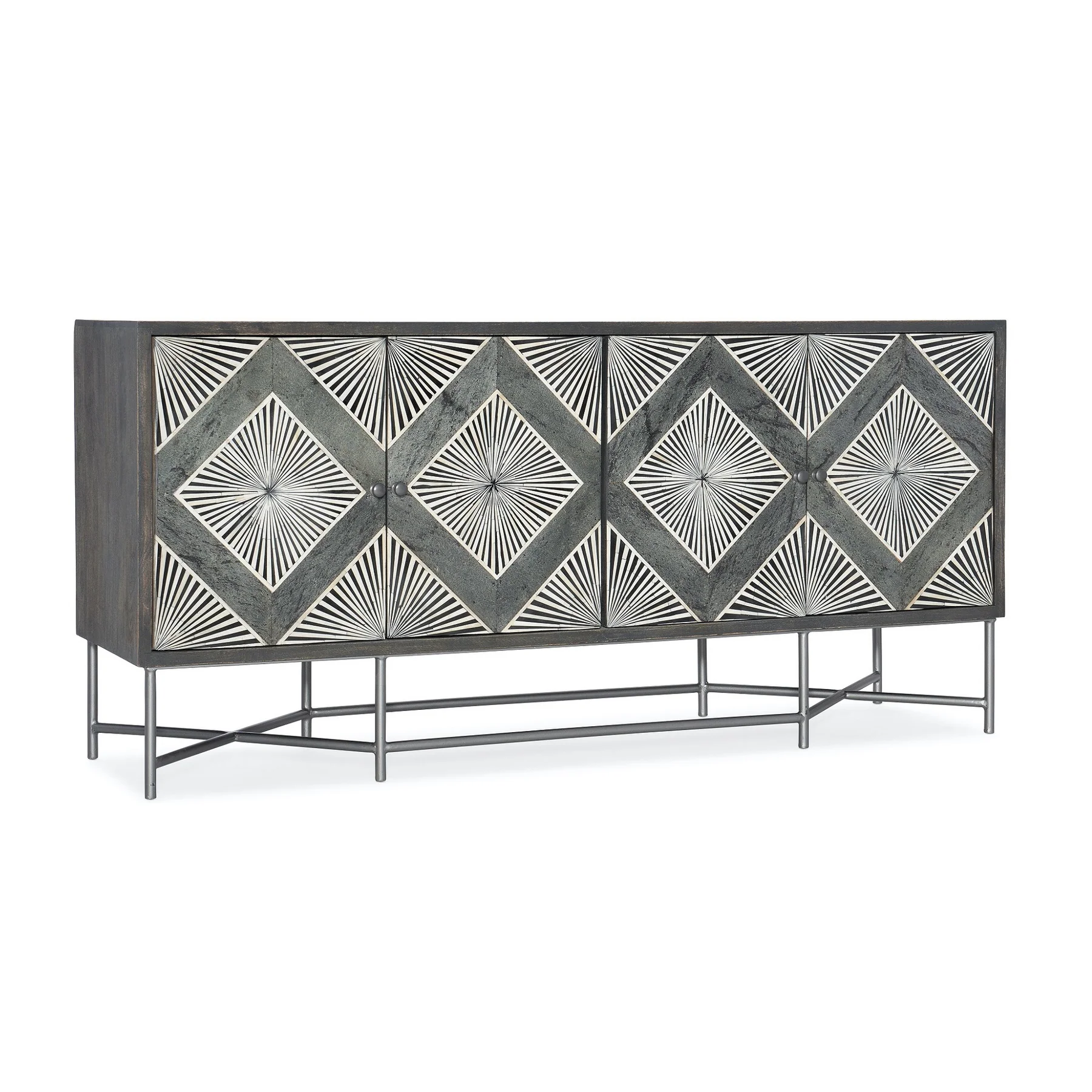 The media-ready Malin Console uses a mix of materials blending inspiration from geometric textiles with a global aesthetic to create a design that is a work of art. Featuring a grey-finished mango wood case, Malin’s four doors are adorned with bursts of contrasting bone inlay that create a striking diamond pattern to add a graphic focal point to a space.