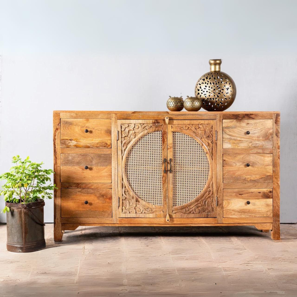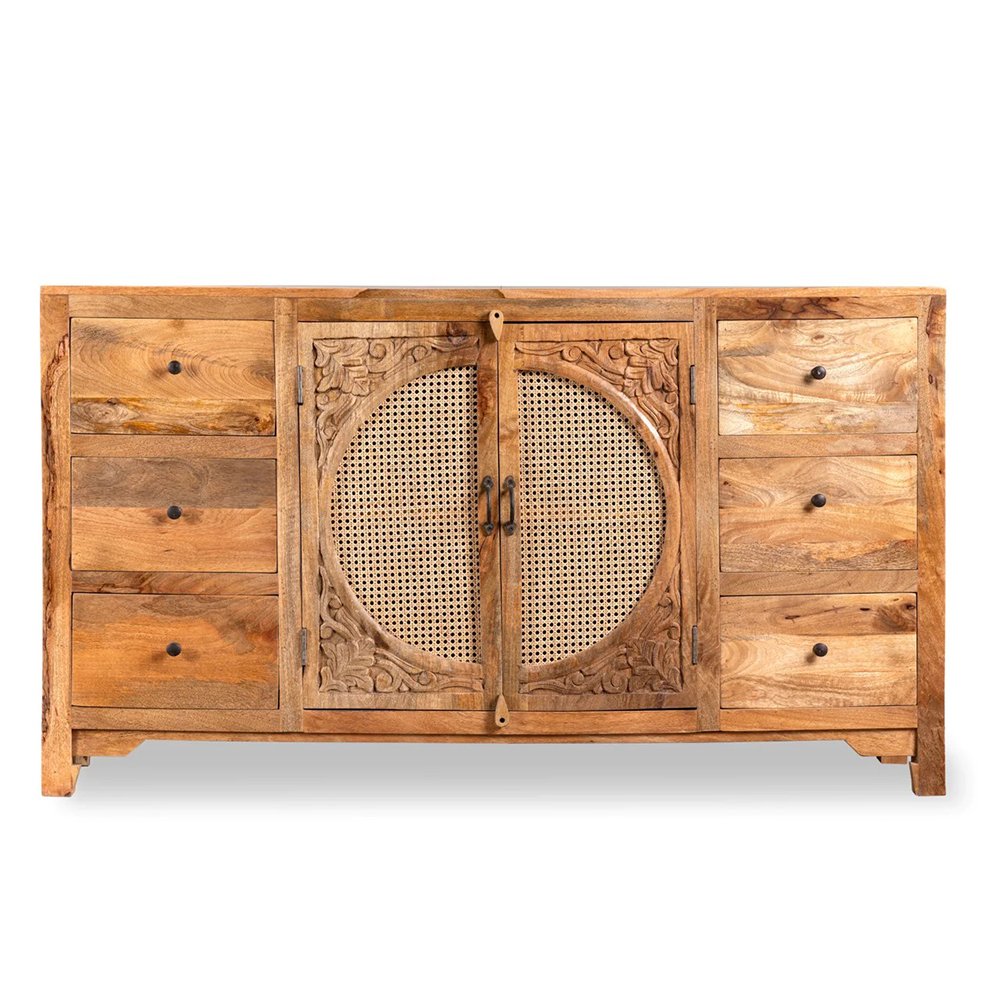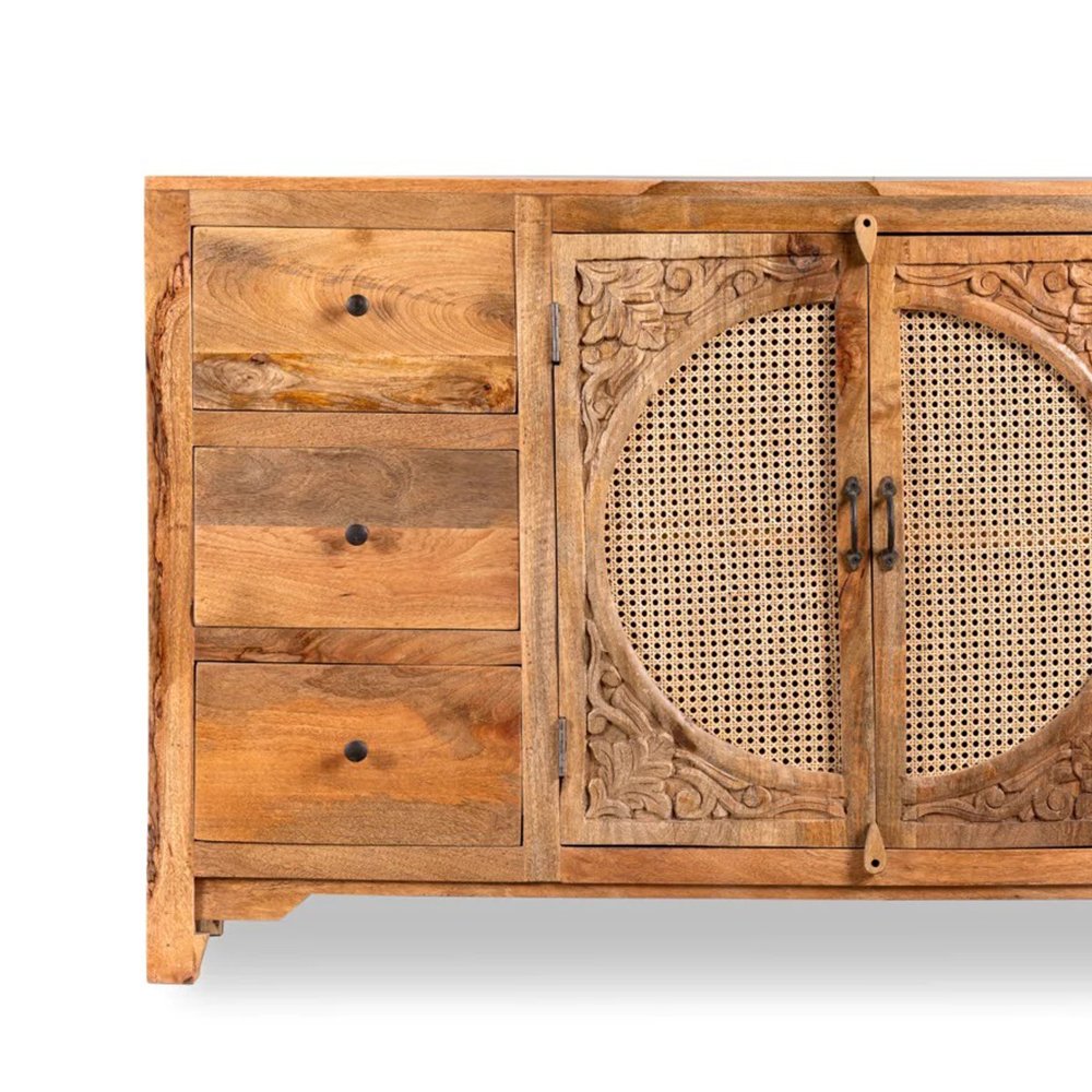 Hand Carving Mid-Century Sideboard With Rattan Work