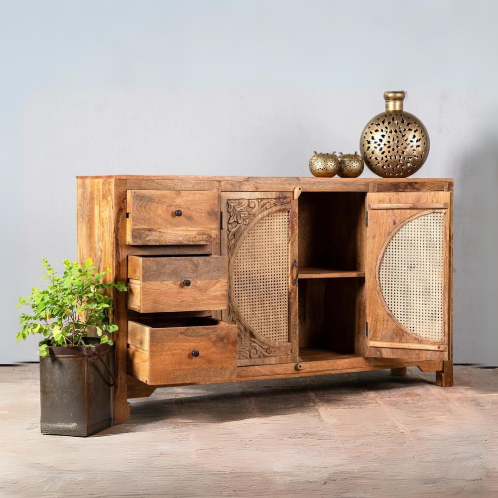 - Mango wood: The unique Sideboard With Rattan is made of solid blue-washed Mango wood. Mango wood is more durable than many other woods and the texture shows diverse and unique colour patterns.