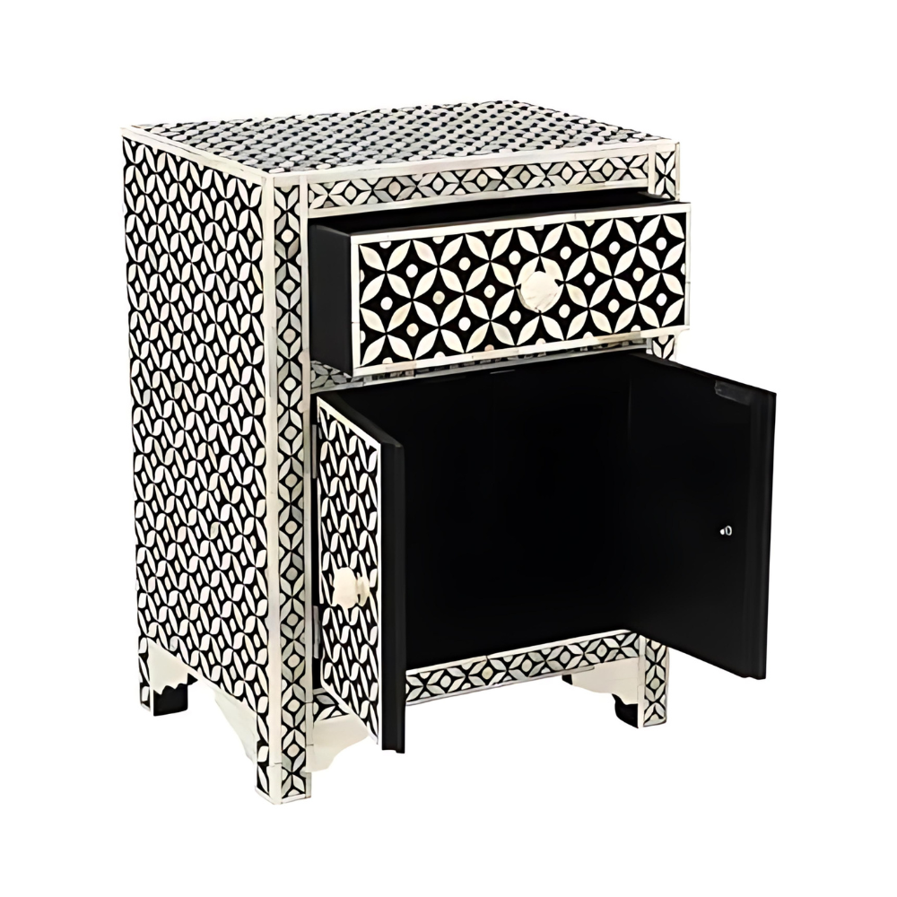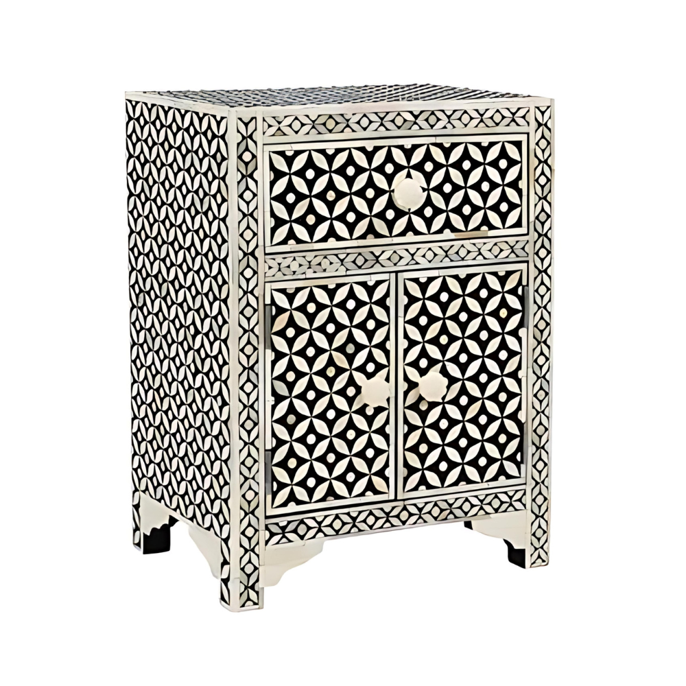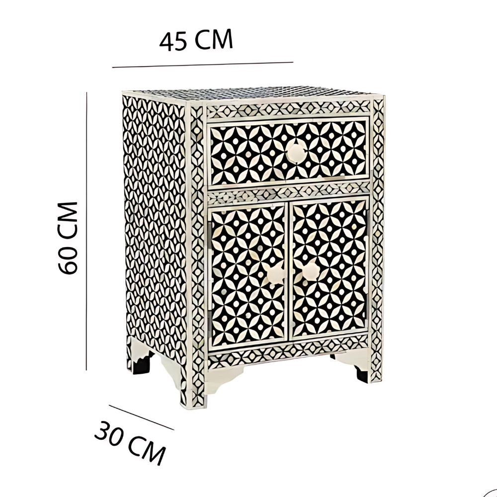 The camel bone has been affixed onto a grey resin constructed around a sturdy wood frame that is sure to last for years and years to come. This bedside features a drawer and two doors with beautifully carved knobs that complement the piece perfectly. The cupboard and drawer also provide a great deal of storage space for anything you might need to stow away.