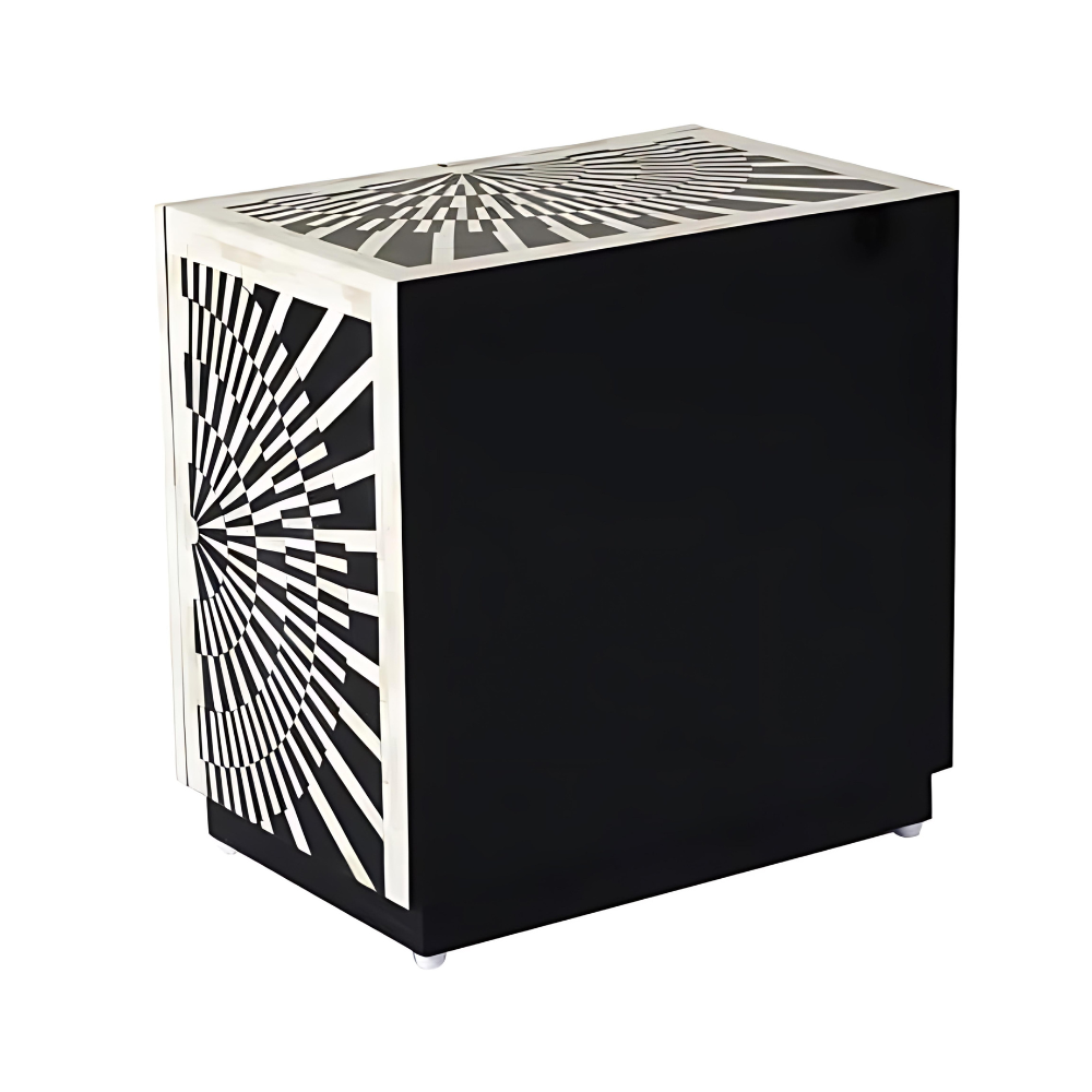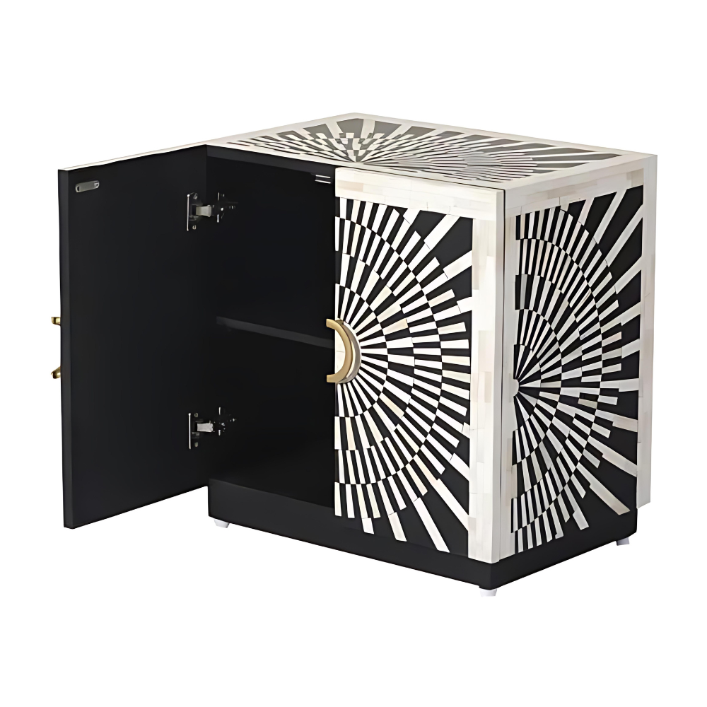 This small cabinet boasts a meticulous combination of Bone Inlay, Solid Wood, and Brass Handles, creating a perfect blend of durability and elegance. The Midnight Black & Bone White color palette adds a touch of monochrome sophistication, aligning seamlessly with the keywords associated with contemporary furniture.