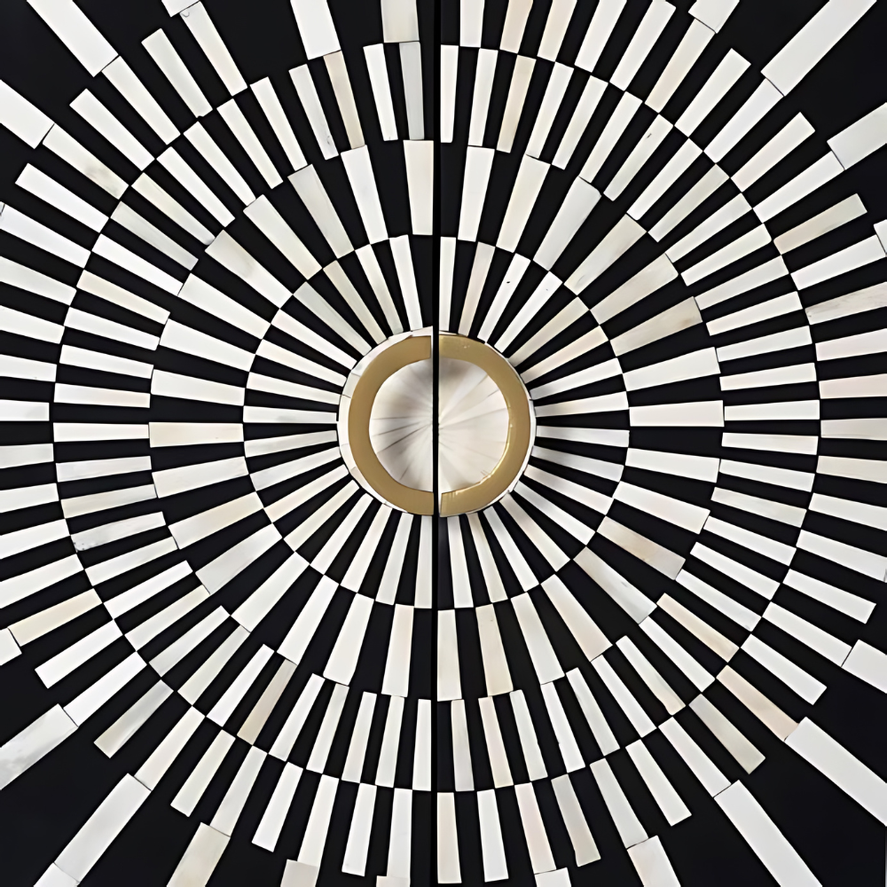 What truly sets this cabinet apart is the intricate ivory design showcased in the bone inlay. The delicate patterns evoke a sense of timeless elegance and sophistication, making it a statement piece within the realm of wooden home decor. The monochrome palette enhances the richness of the ivory details, creating a visual masterpiece that transcends traditional boundaries. Adding to its allure are the brass handles, providing both functionality and a touch of luxury. The brass accents not only complement the monochrome design but also add a subtle gleam to the cabinet, creating a harmonious interplay of materials and finishes.
