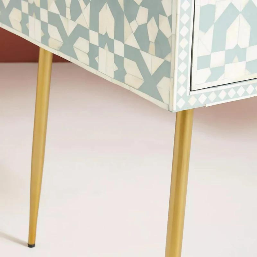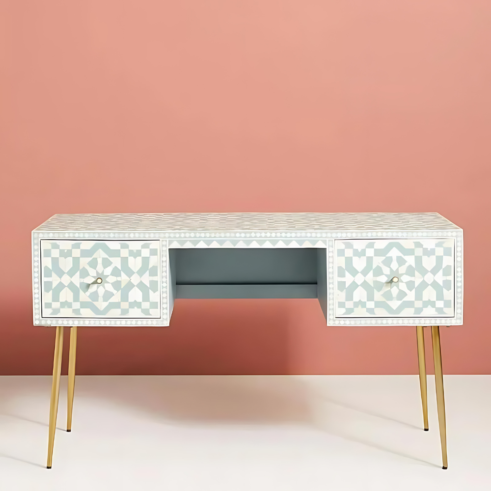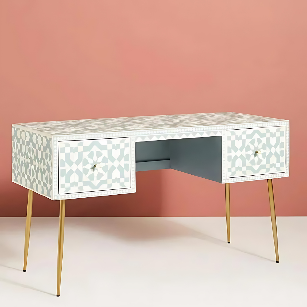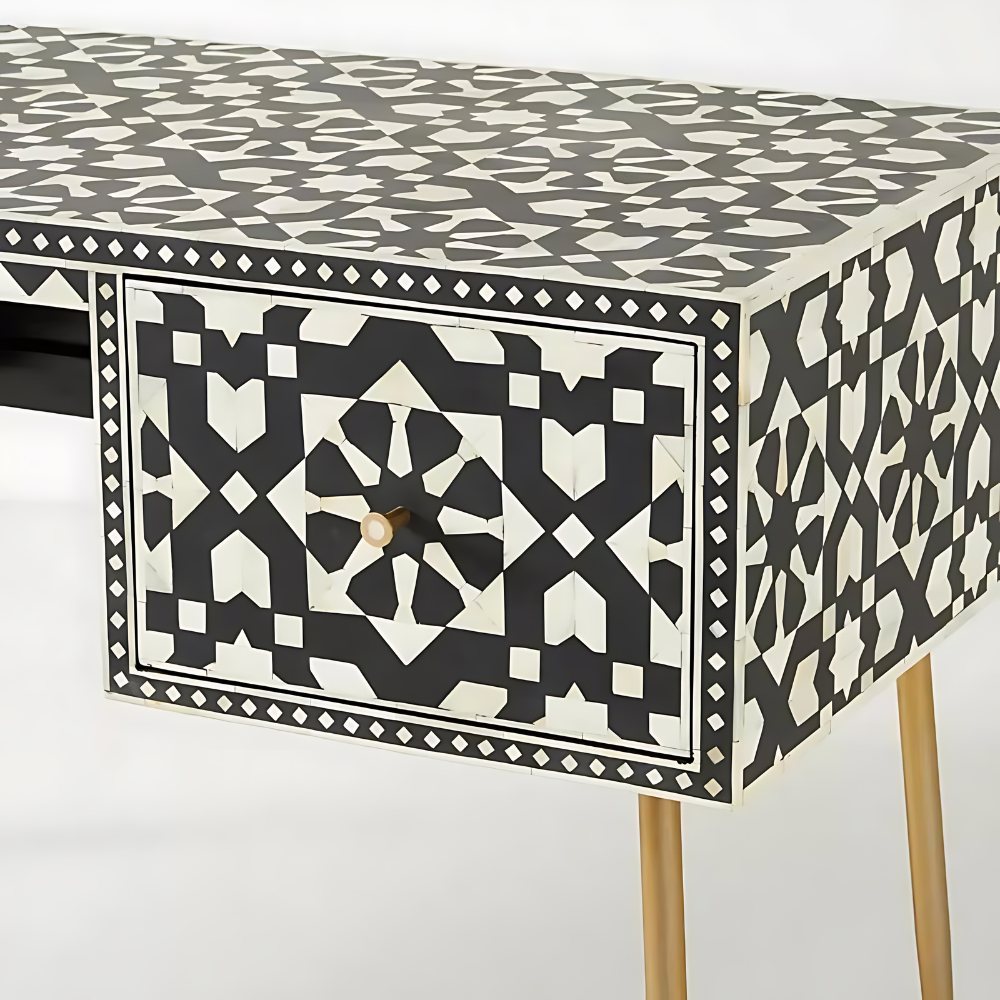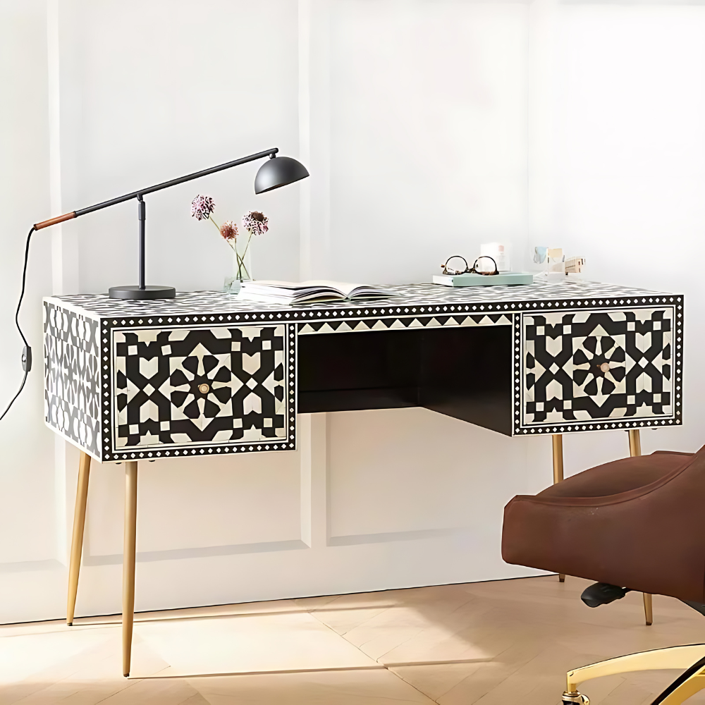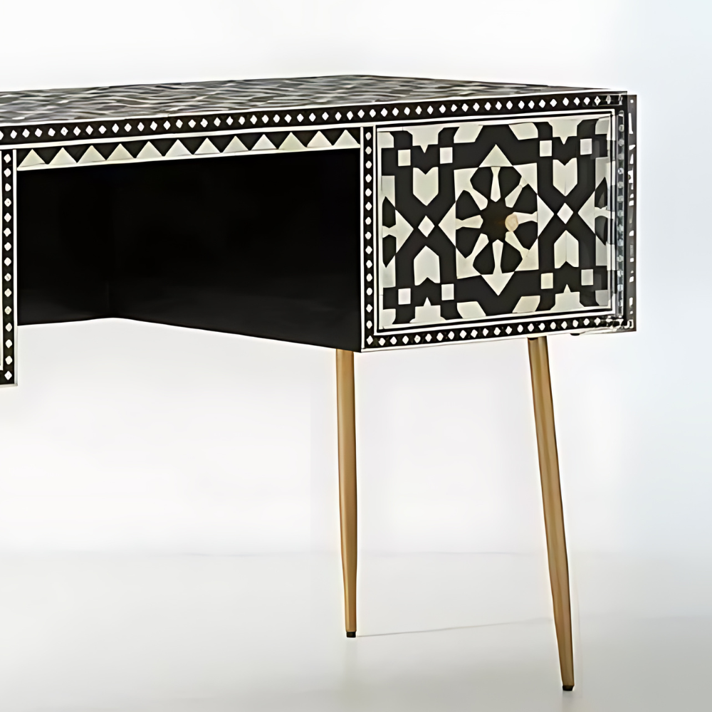 Transform your workspace into a haven of style and sophistication with the Moroccan Bone Inlay Desk. Crafted with meticulous artistry, this desk showcases intricate bone inlay patterns that create a mesmerizing visual display. The smooth surface provides ample space for your laptop, paperwork, and other essentials, while the drawers offer convenient storage for keeping your workspace organized. The elegant design and timeless beauty of the bone inlay add a touch of luxury to any office or study. Whether you’re working from home or pursuing creative endeavors, the Moroccan Bone Inlay Desk combines functionality with exquisite craftsmanship, making it a statement piece that inspires productivity and enhances your decor.