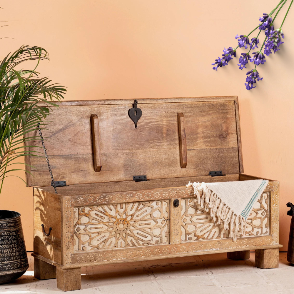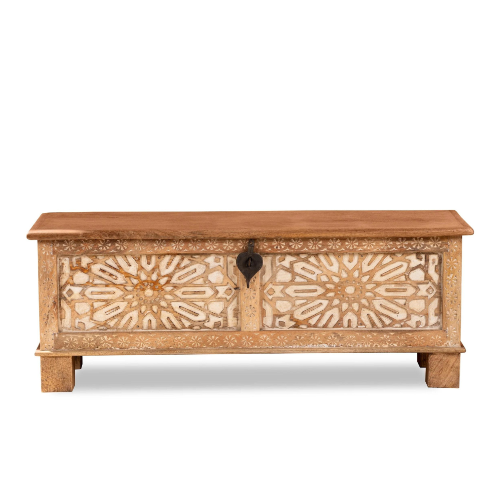 The redefined Nanup Hand Carved Trunk Box has a Mediterranean style and will be an eye-catcher in your living room, your bedroom, or your bathroom. With its large compartment, it offers a lot of storage space. The front of the trunk box is richly decorated with carvings.