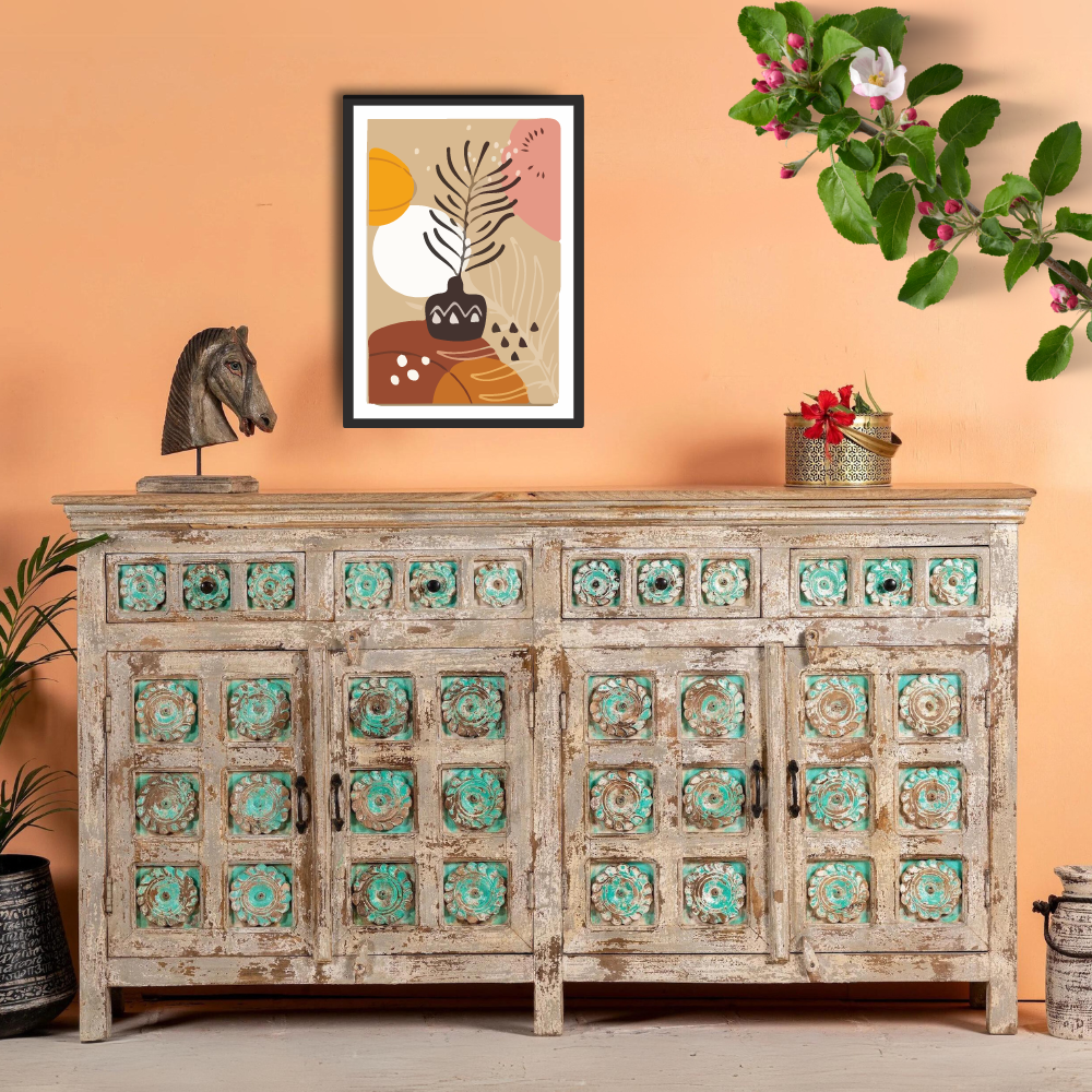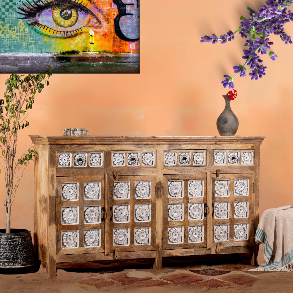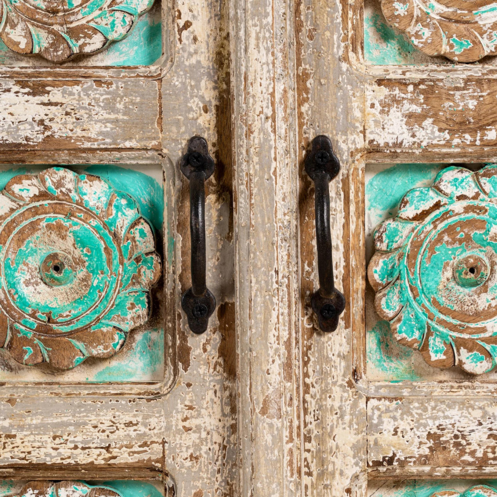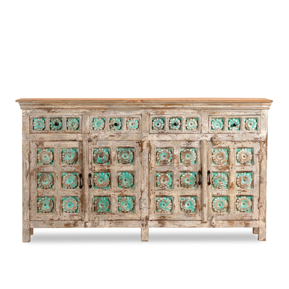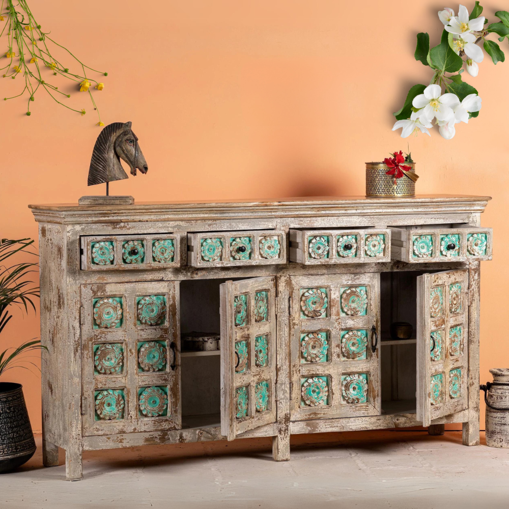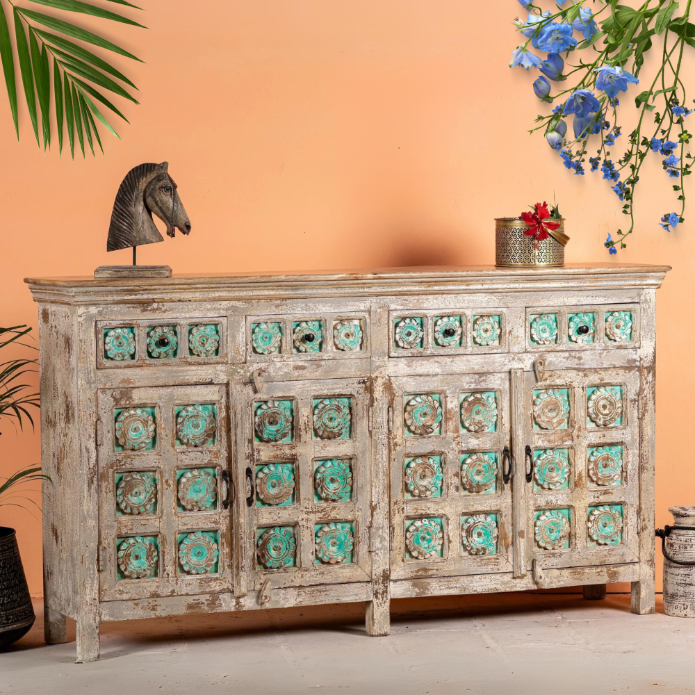 An exceptional handcrafted Indian sideboard that combines the beauty of mango wood with intricately engraved designs adorned with turquoise details. This stunning piece of handcrafted Indian furniture showcases the artistry and craftsmanship of skilled artisans.