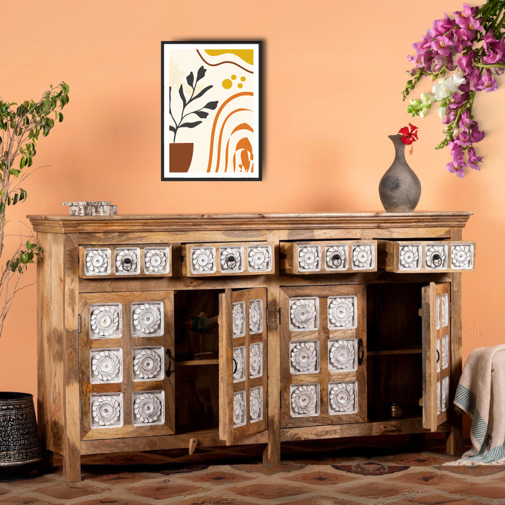 - Mango wood: The unique Sideboard is made of solid Mango wood. Mango wood is more durable than many other woods and the texture shows diverse and unique color patterns.
