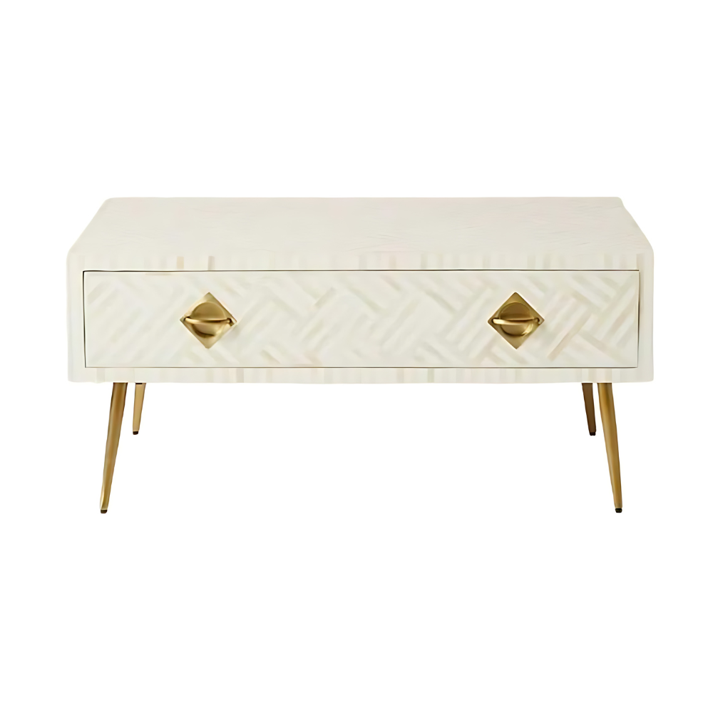 Immerse yourself in the beauty of our Optical Design bone-inlay coffee table with drawers. This exquisite piece showcases an enchanting bone inlay design, meticulously crafted to captivate your senses. The intricate patterns, delicately handcrafted by skilled artisans, bring a touch of elegance and uniqueness to your living space. With its generous surface area, this coffee table offers ample room for your favorite books, decor items, or beverages. The drawers provide convenient storage for remotes, coasters, and other essentials, keeping your space organized and clutter-free. Let this remarkable bone-inlay coffee table become the centerpiece of your living room, radiating timeless charm and sophistication.