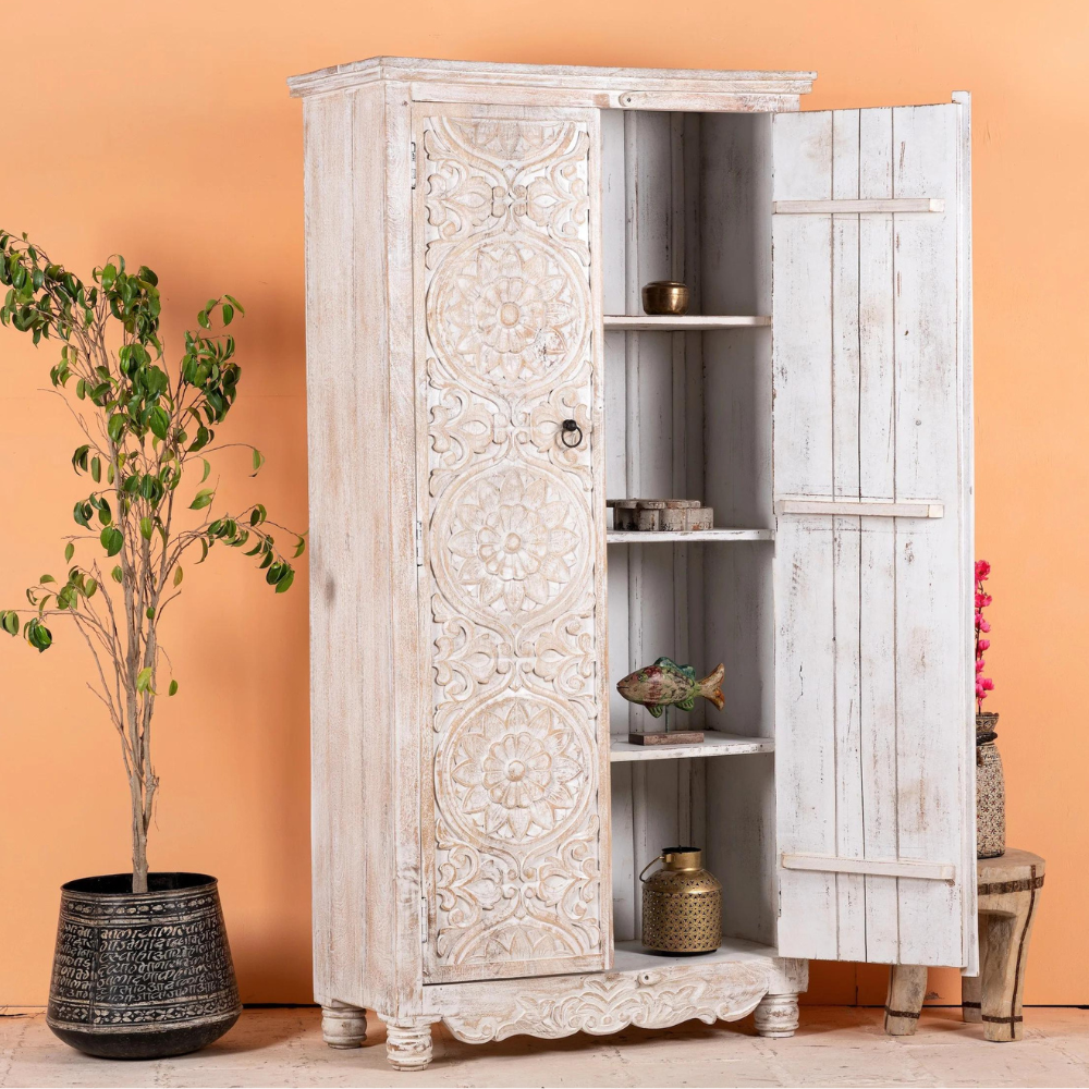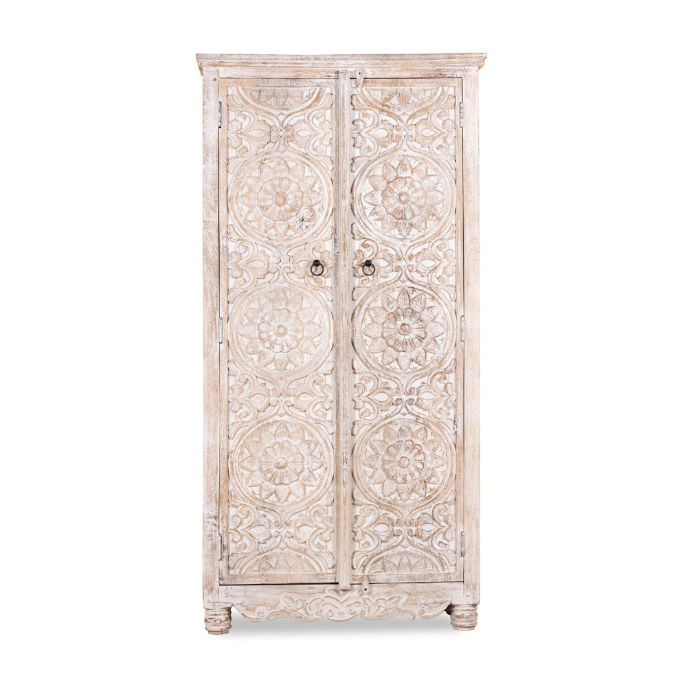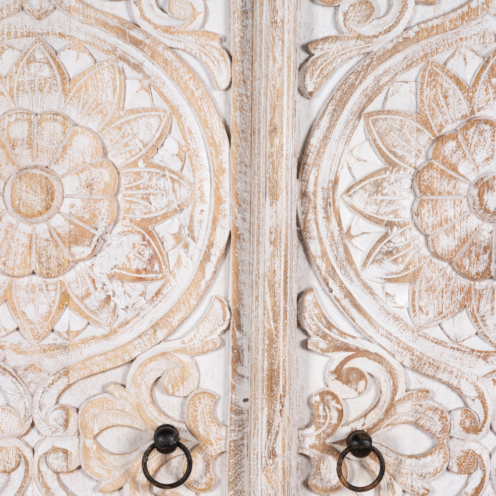 Roy Rustic White Wardrobe has a Mediterranean style and will be an eye-catcher in your living room, your bedroom, or your bathroom. Four large compartments offer plenty of storage space. The doors are richly decorated with handmade floral carvings.