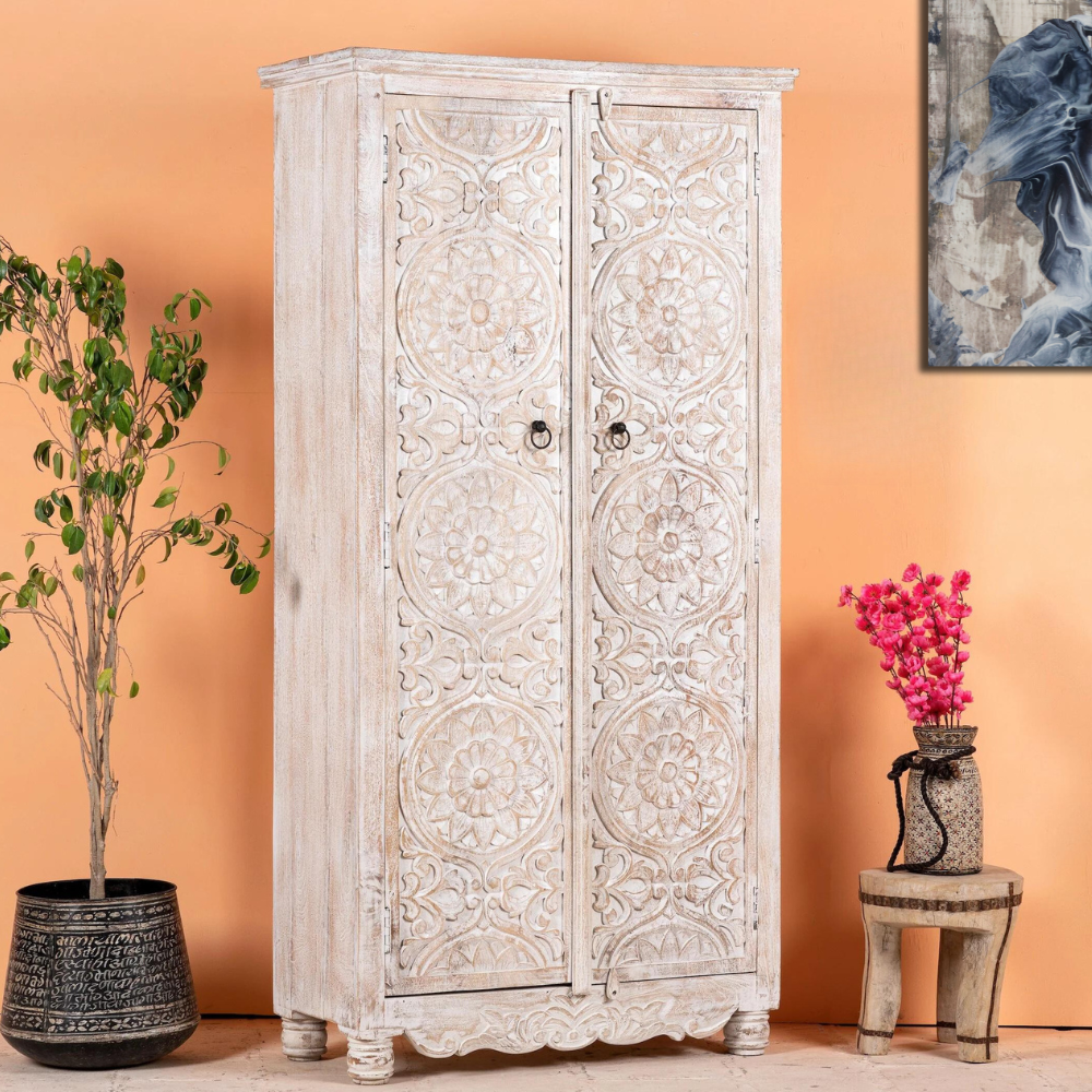 Functional Elegance Hand Carved Roy Rustic White Wardrobe