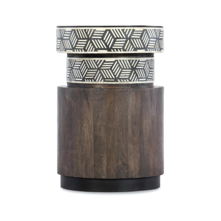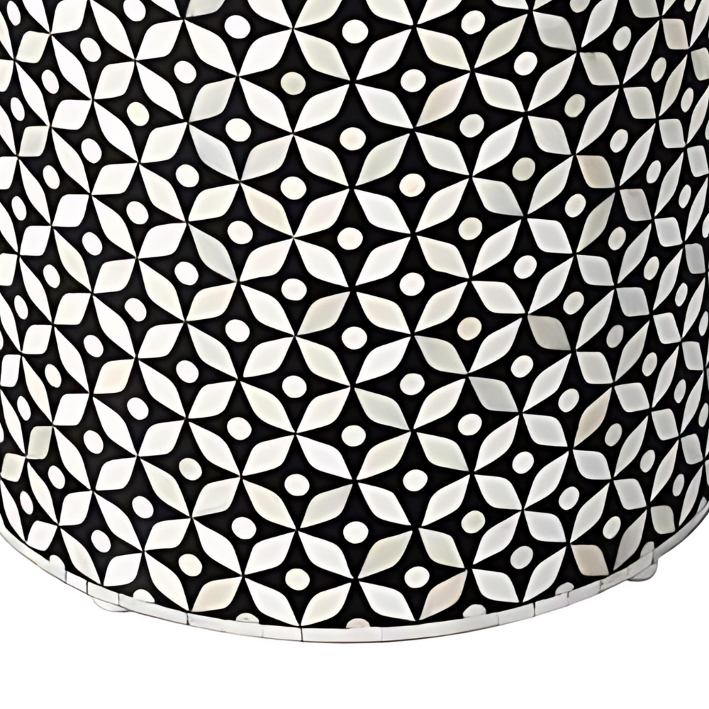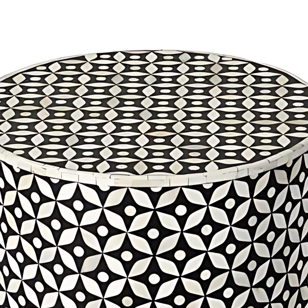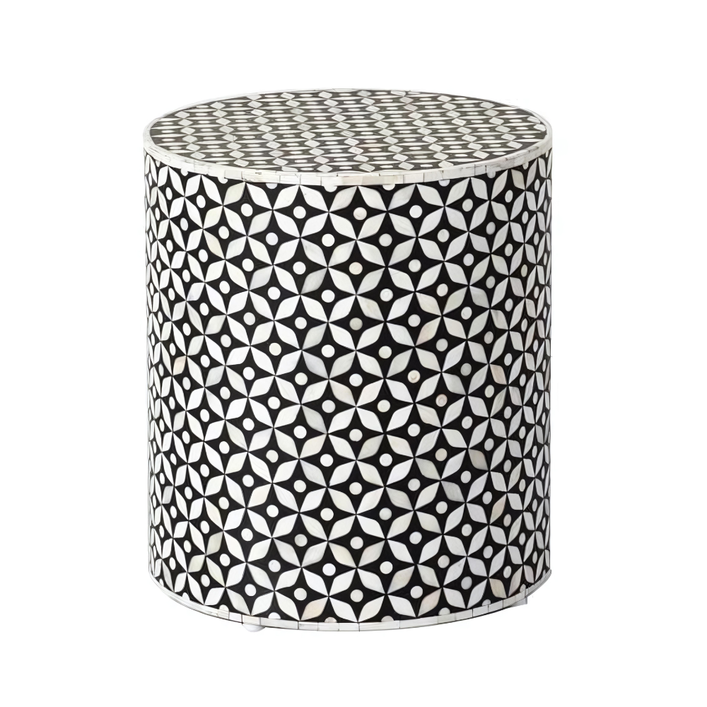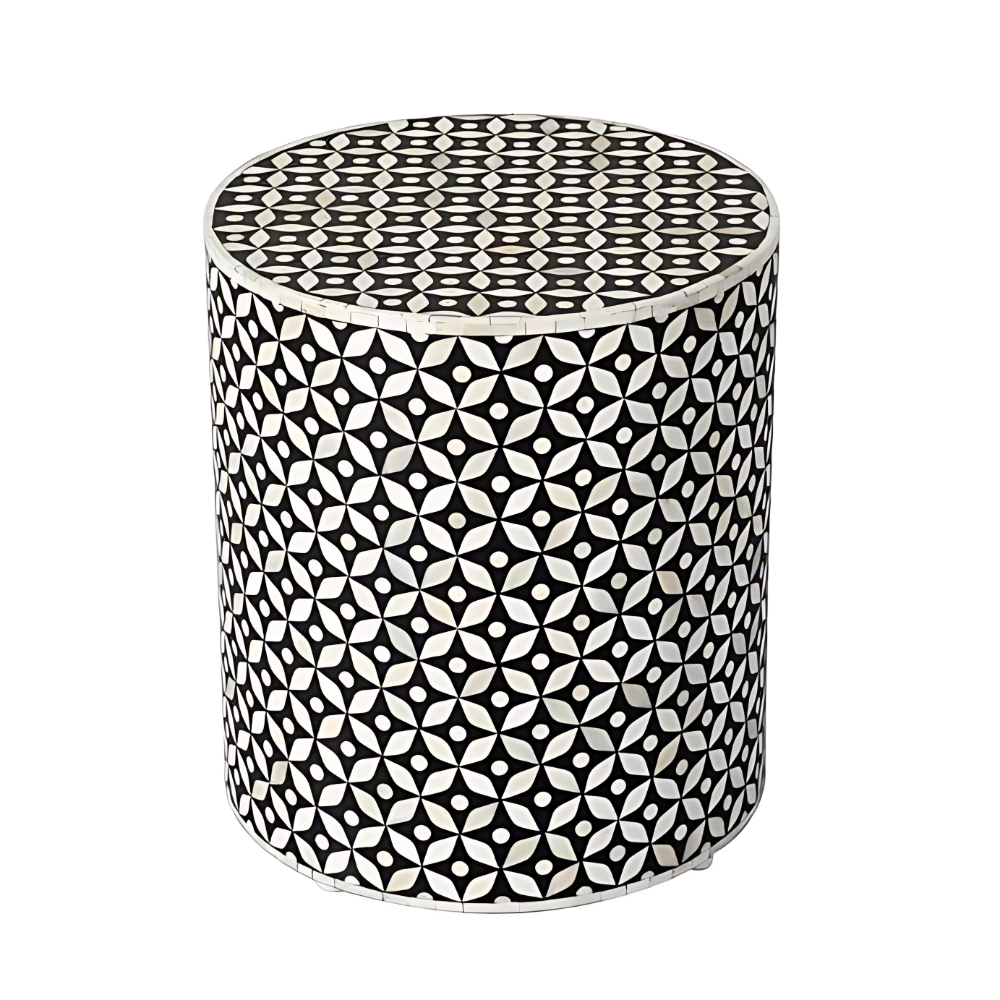 Designed in a cylindrical shape, this stool/end table seamlessly combines form and function. The Midnight Black & Bone White color palette reflects the essence of wooden home decor in Singapore, offering a sophisticated addition to your home. With no assembly required, the Royal Geo Pattern Bone Inlay Stool/End Table brings a touch of luxury and convenience to your space.