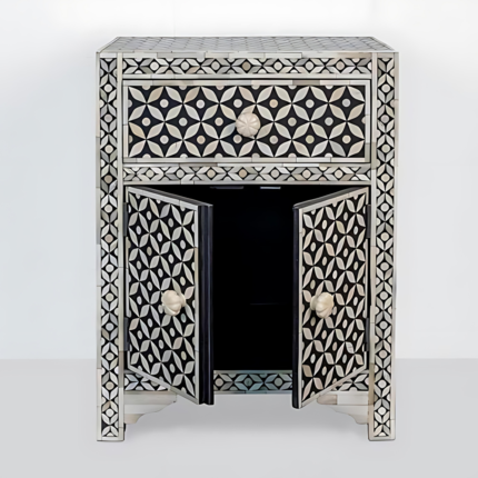 Elevate your living space with this regal piece, blending the intricate craftsmanship of bone inlay with the timeless appeal of solid wood. The Royal Geo Pattern, displayed in Midnight Black & Bone White, creates a stunning visual contrast, making it a true focal point in contemporary furniture in India.