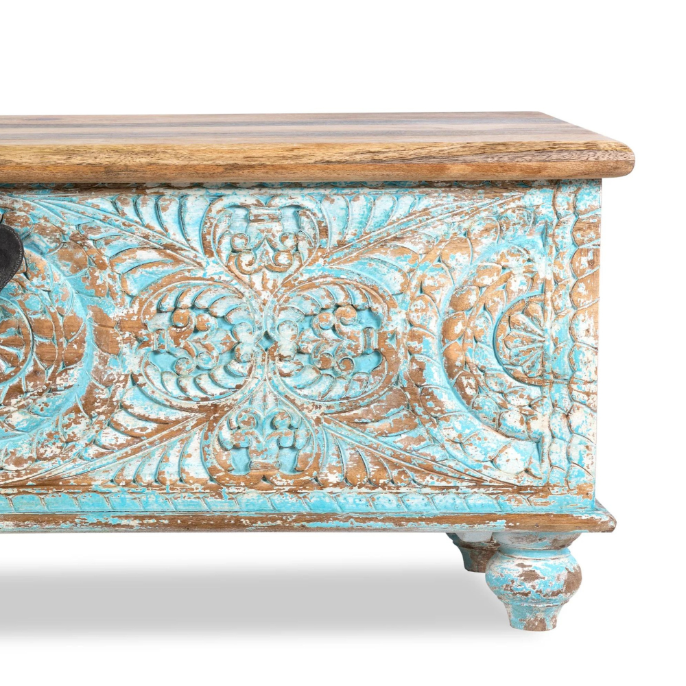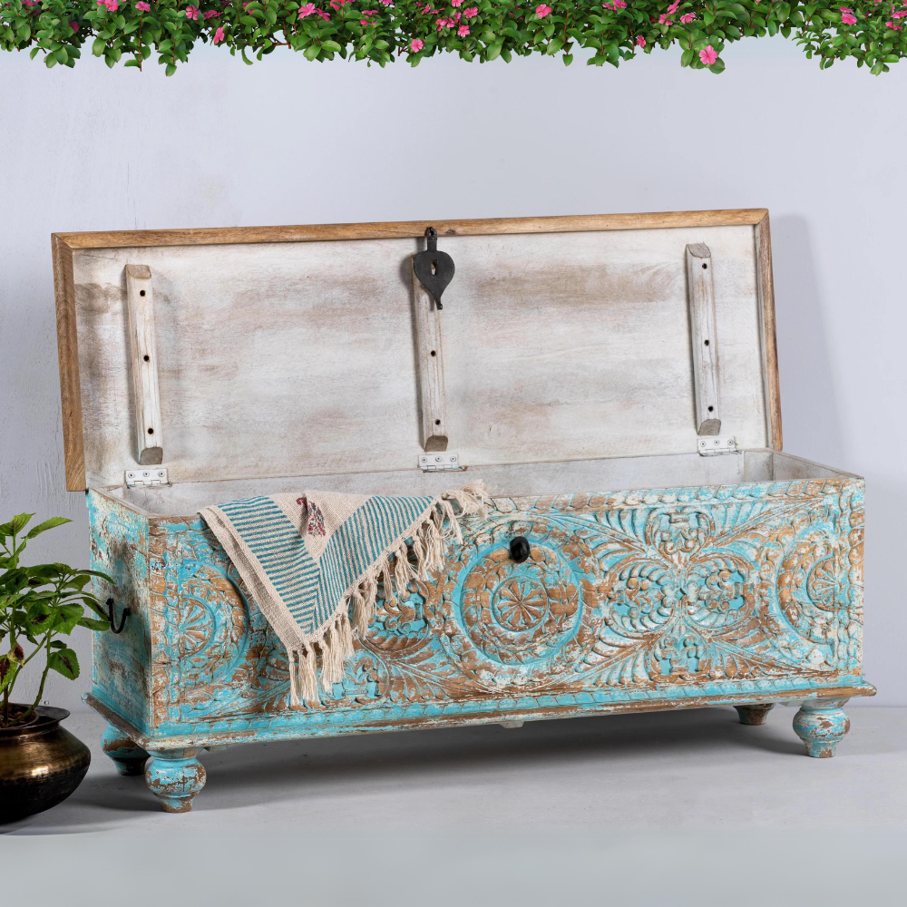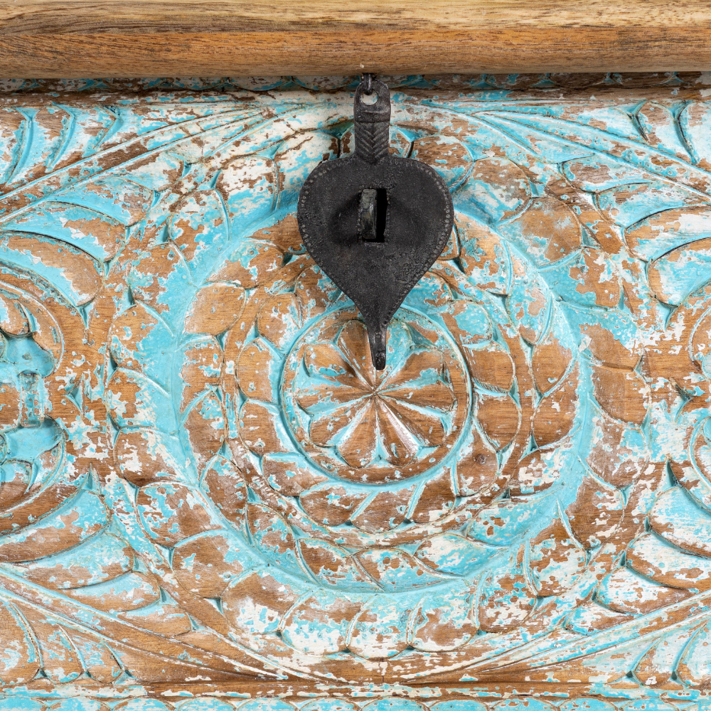 Rustic Blue Storage Trunk Box has an exotic style and will be an eye-catcher in your living room, your bedroom, or your bathroom. With its large compartment, it offers a lot of storage space. The front of the trunk box is richly decorated with handmade floral carvings. The striking blue color with a natural top and a beautiful iron lock will bring summer feelings and a Boho flair to every surrounding.