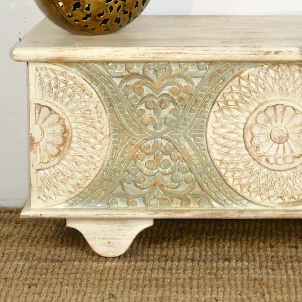 Hand Carved Rustic White Trunk Box has a Mediterranean style and will be an eye-catcher in your living room, your bedroom, or your bathroom. With its large compartment, it offers a lot of storage space. The front of the trunk box is richly decorated with floral handmade carvings. The functional wooden wheels are special. This handmade product is one of a kind.