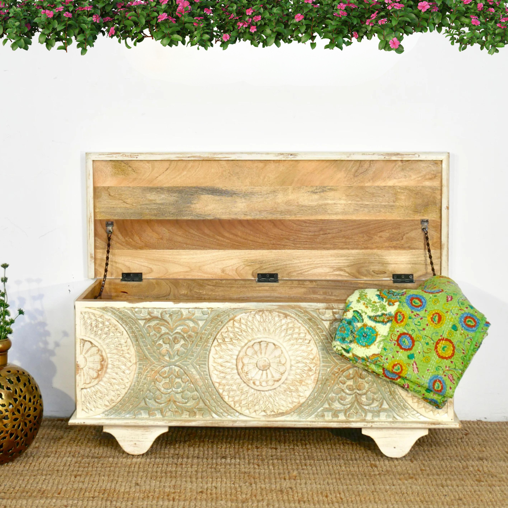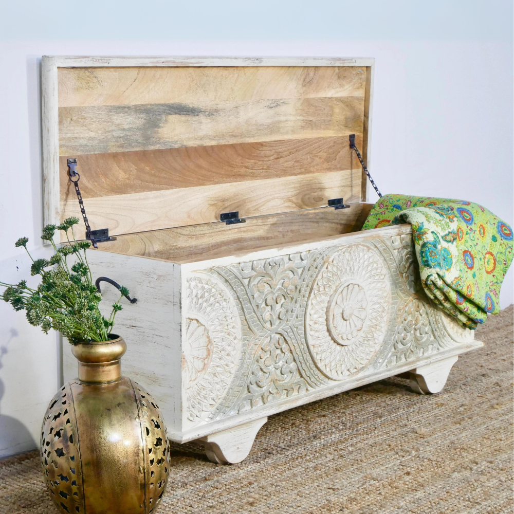 • Mango Wood: The unique Hand Carved Rustic White Trunk Box is made of solid Mango wood. Mango wood is more durable than many other woods and the texture shows diverse and unique color patterns.